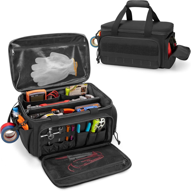 Portable storage: The main compartment features four open pockets and one large central zippered pocket, suitable for storing hand tools or small power tools such as wrenches, pliers, small screwdrivers, digital multimeters. Visible pockets on the top can accommodate manuals, drawings, cables, etc.