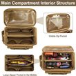 Convenient accessory storage: The front compartment is equipped with elastic band holders, slots, and mesh pockets, allowing you to store small tools according to your needs. The side pockets are designed for storing batteries, gloves, and other accessories. There is a side hanging strap with a rotating snap button for attaching tape or tape measure.