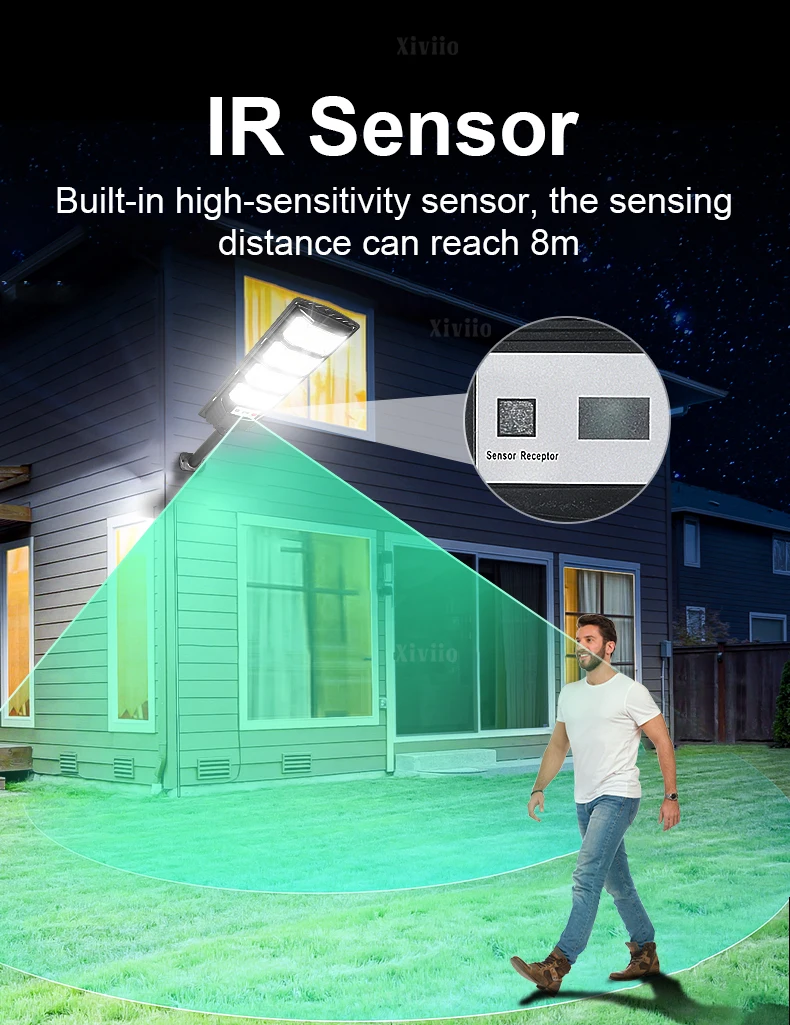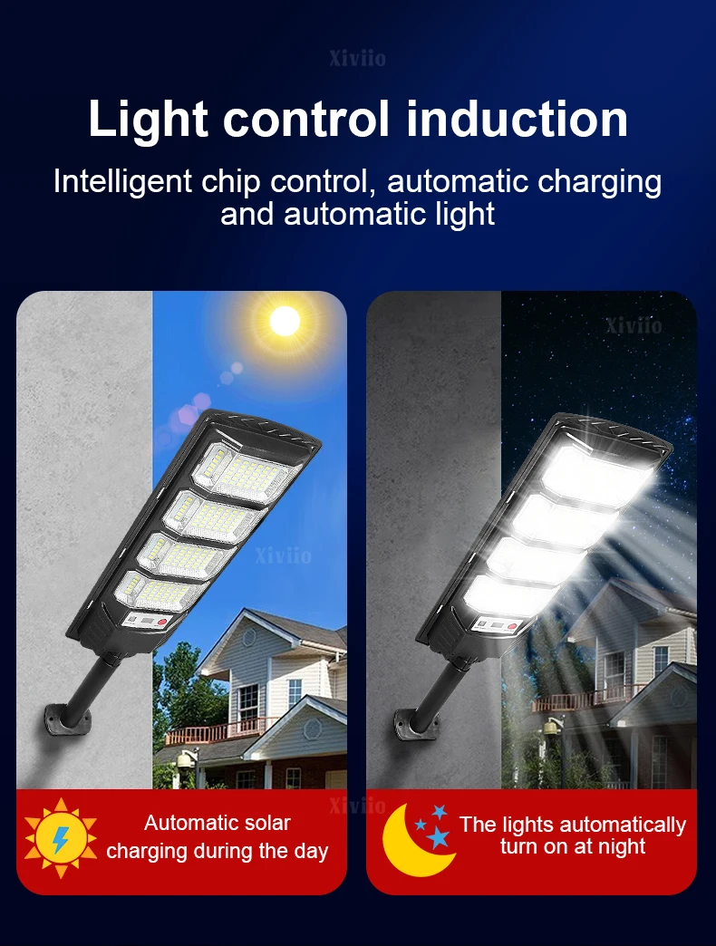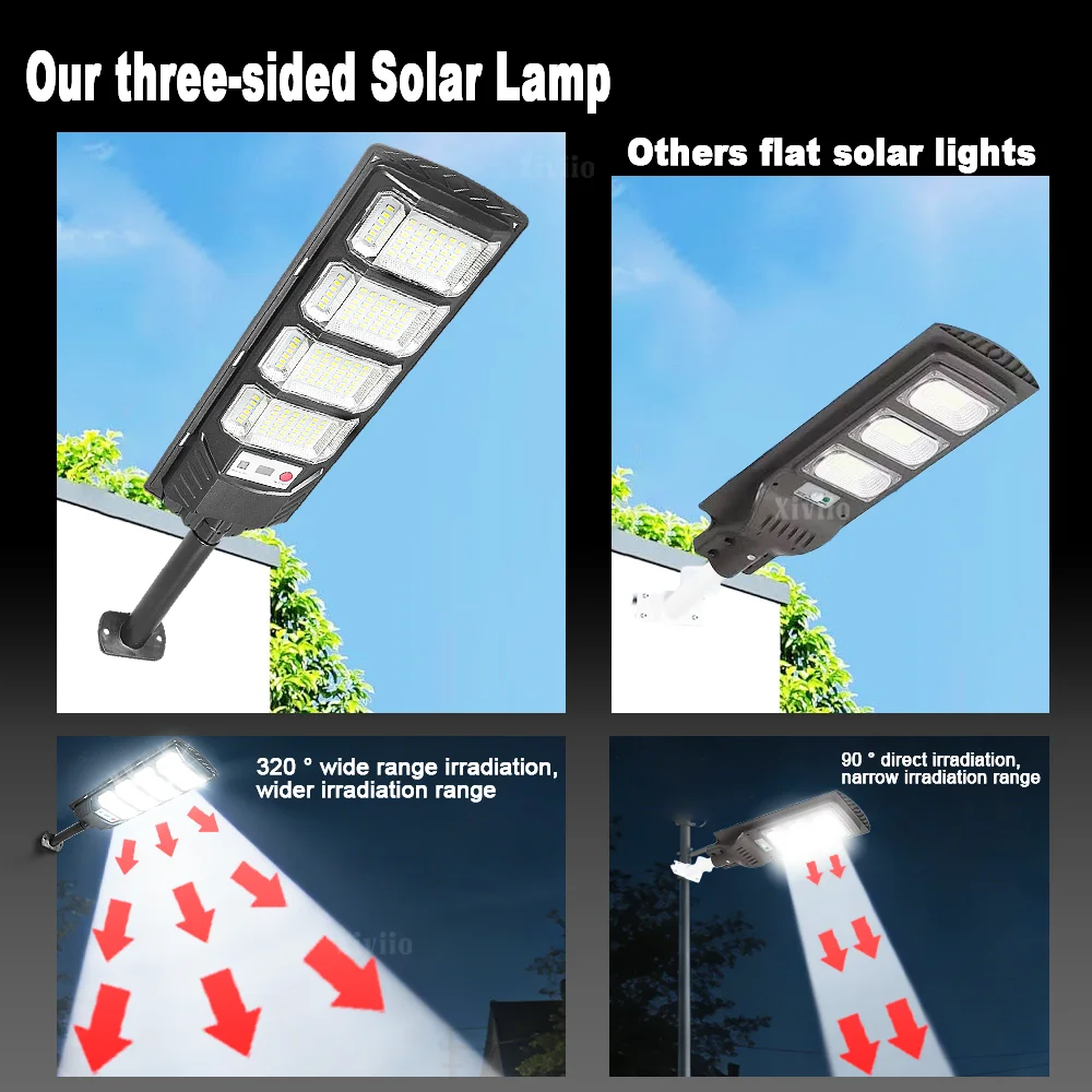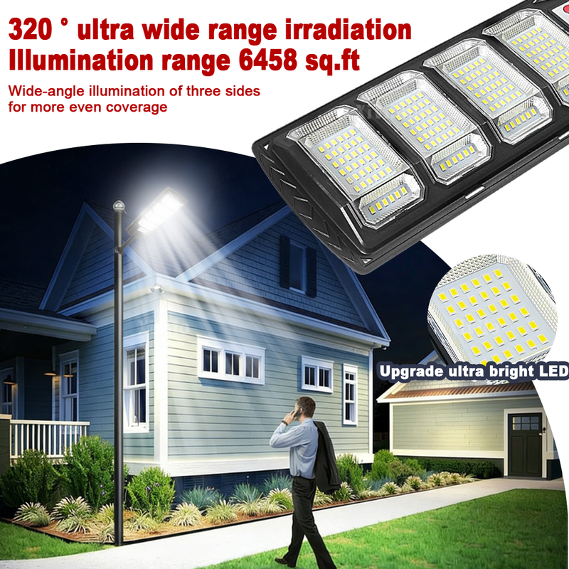 Equipped with the latest large-size high-brightness wick and 15000W super power, you are not afraid of the dark night. Three-sided slightly curved design + 320° wide range of illumination + high-gloss reflective lamp cup, wider range, easily illuminates every corner, the brightness and illumination range are 10 times that of ordinary flat solar lights. The solar lamp has a Motion Sensor, which automatically triggers the sensor to turn on the light when there are people or objects moving within 10 meters at night. (Sensing range is 120°), supports remote control of solar lights, switches 10 levels of brightness, or 3h/5h/8h scheduled lighting to meet the lighting needs of different scenes. Equipped with large solar panels, the photoelectric conversion rate is as high as 50%. Built-in 20000mAh large-capacity battery enables fast charging and long-term lighting. The fuselage has been fully upgraded with thickened ABS material and IPX67 waterproof rating, which comprehensively improves the waterproof, lightning protection and anti-freeze performance, greatly improves the durability, and can be used normally in harsh environments. The packaging is upgraded to use multi-layer thickened foam bags + thickened packaging boxes to protect the product from damage during transportation. The 3 sizes of solar lights are suitable for a variety of scenes, including balconies, gardens, backyards, streets, and parks, to meet your different lighting needs.<<Product parameters>>