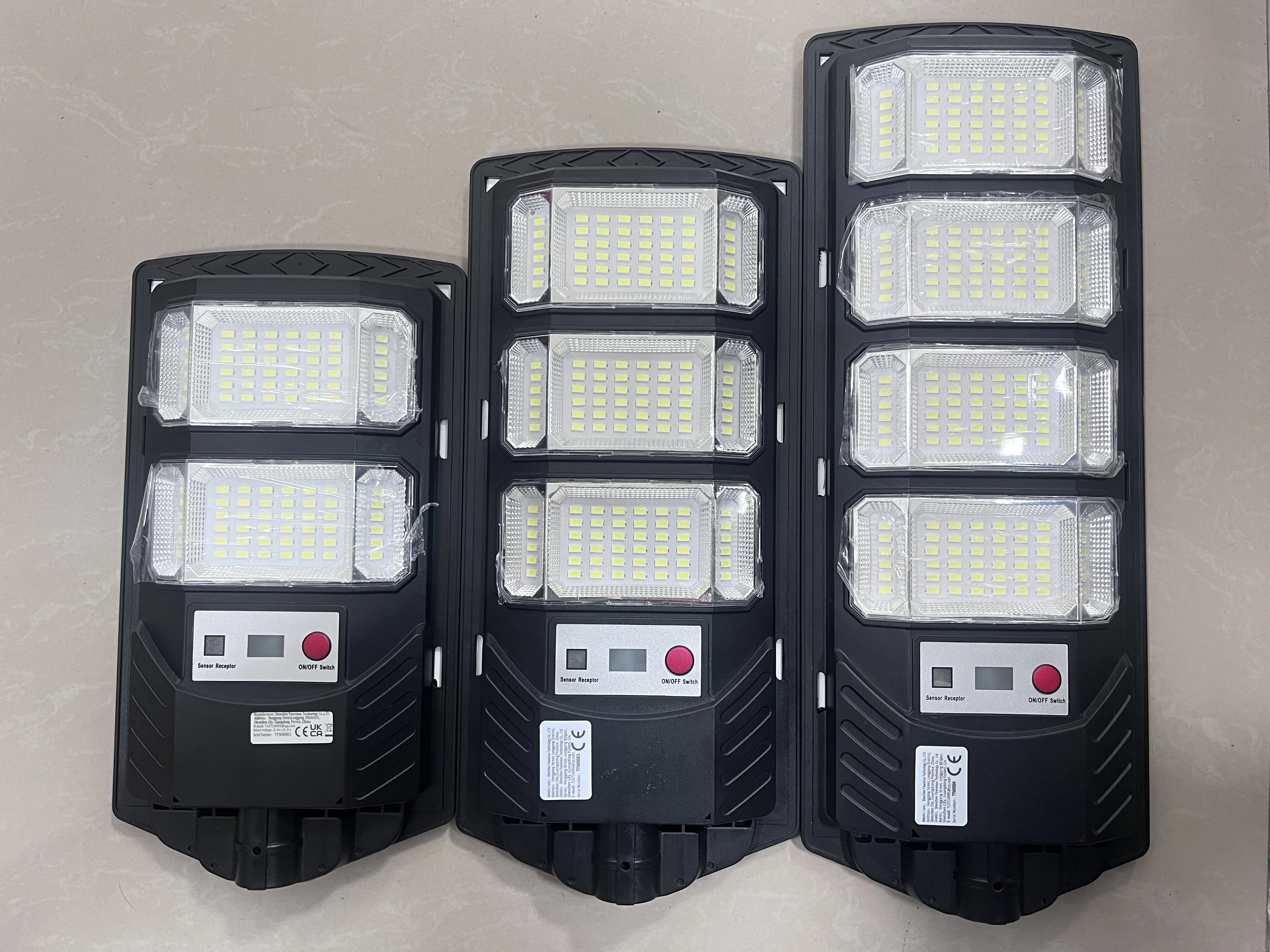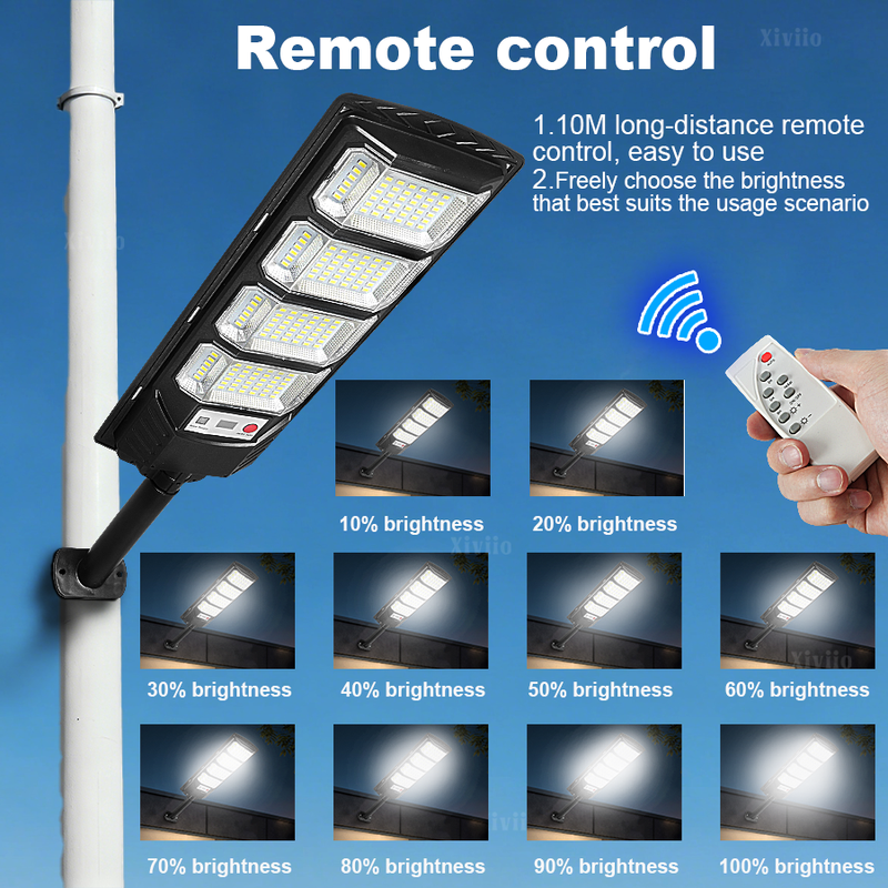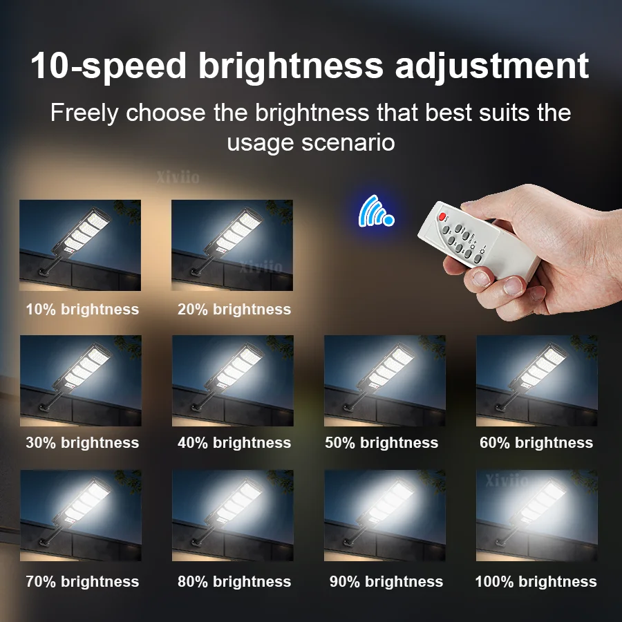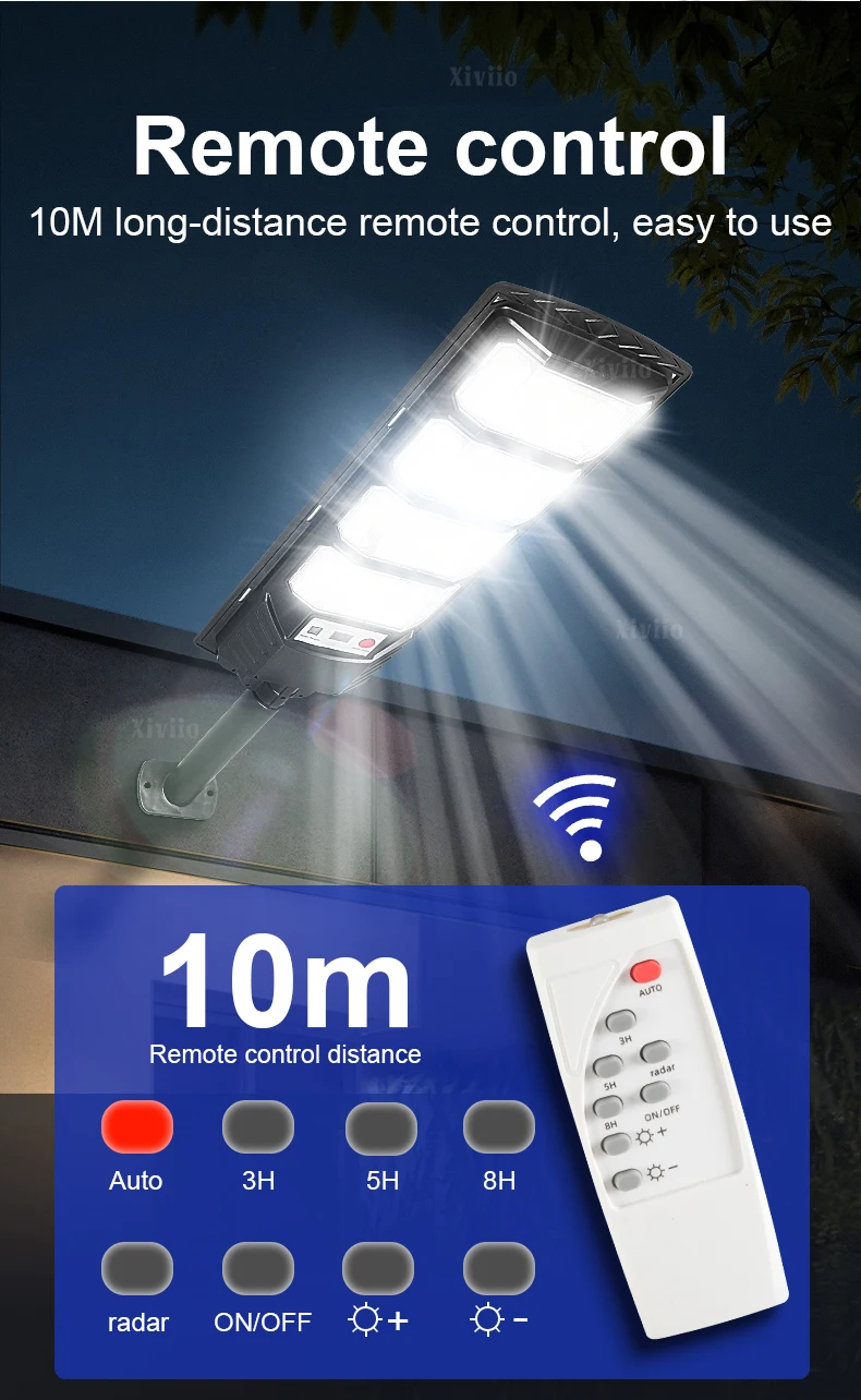 Equipped with the latest large-size high-brightness wick and 15000W super power, you are not afraid of the dark night. Three-sided slightly curved design + 320° wide range of illumination + high-gloss reflective lamp cup, wider range, easily illuminates every corner, the brightness and illumination range are 10 times that of ordinary flat solar lights. The solar lamp has a Motion Sensor, which automatically triggers the sensor to turn on the light when there are people or objects moving within 10 meters at night. (Sensing range is 120°), supports remote control of solar lights, switches 10 levels of brightness, or 3h/5h/8h scheduled lighting to meet the lighting needs of different scenes. Equipped with large solar panels, the photoelectric conversion rate is as high as 50%. Built-in 20000mAh large-capacity battery enables fast charging and long-term lighting. The fuselage has been fully upgraded with thickened ABS material and IPX67 waterproof rating, which comprehensively improves the waterproof, lightning protection and anti-freeze performance, greatly improves the durability, and can be used normally in harsh environments. The packaging is upgraded to use multi-layer thickened foam bags + thickened packaging boxes to protect the product from damage during transportation. The 3 sizes of solar lights are suitable for a variety of scenes, including balconies, gardens, backyards, streets, and parks, to meet your different lighting needs.<<Product parameters>>