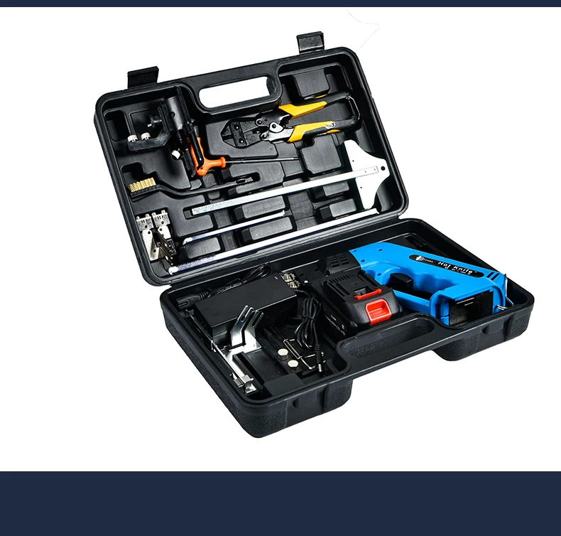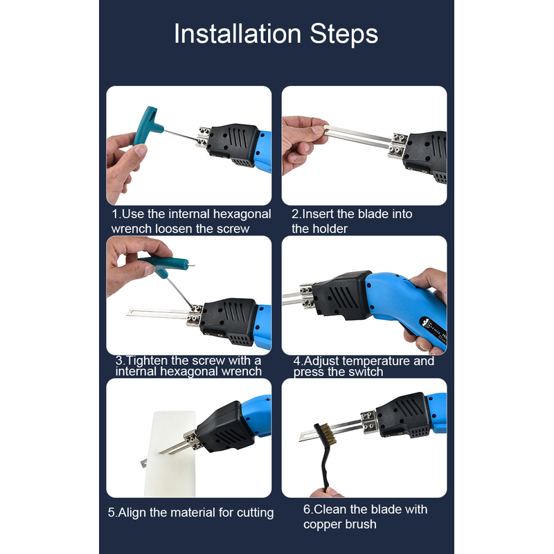 Installation:NOTE: Always unplug cord of the Thermal Cutter (Hot knife)before installing or removing the blades. Allow sufficient cooling time for blades, blade holders and metal thumb wheels before handing.1 x plastic suitcase