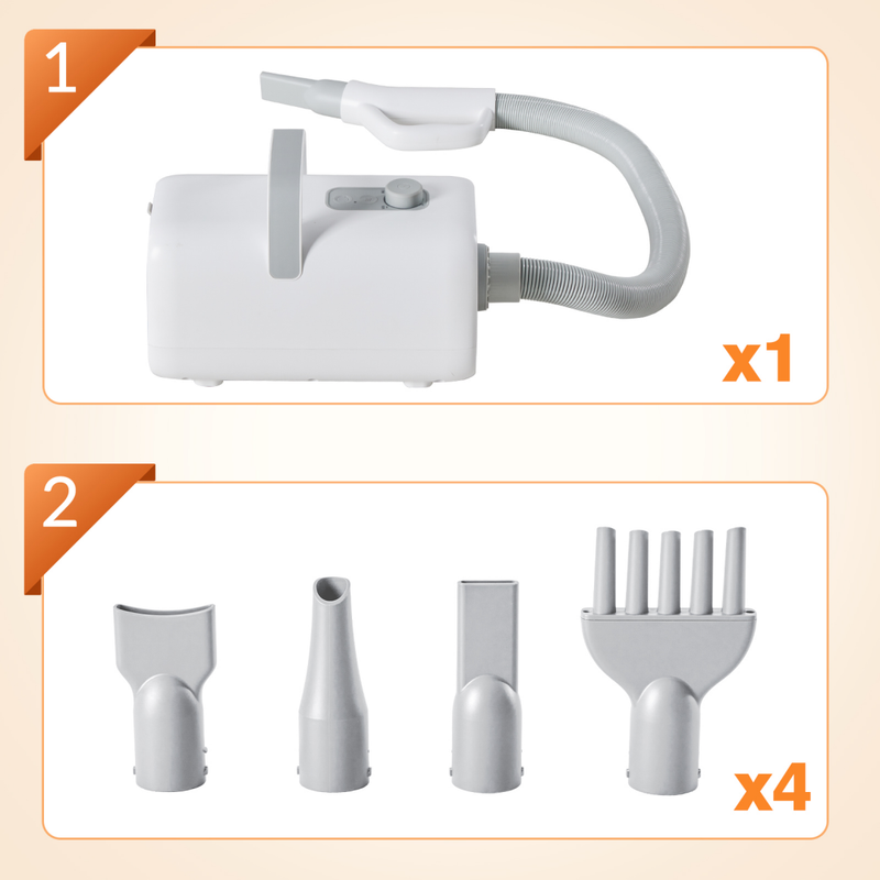 Rich accessories: equipped with 4 interchangeable nozzles, customizable drying method according to pet type; The ergonomic handle is compact and lightweight, making it easy to carry.
