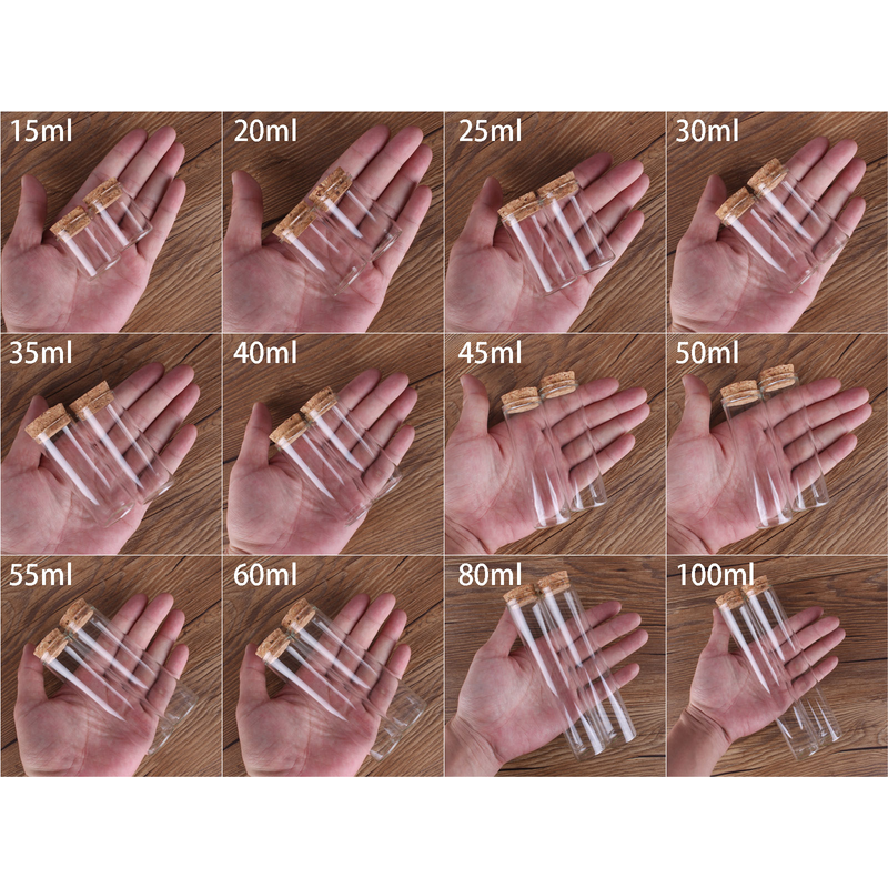 15ml/25ml/30ml/35ml/40ml/45ml/50ml/55ml/60ml/80ml/100ml Small Glass Test Tube with Cork Stopper Dragees Jars Bottles 24 pieces