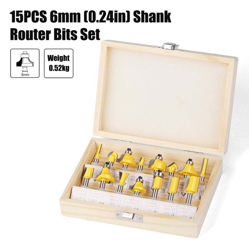 15PCS 1/4in 1/2in 6mm 8mm Shank Router Bit Set Trimming Straight Beading Milling Cutter Carbide Cutting Woodworking Tools