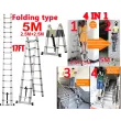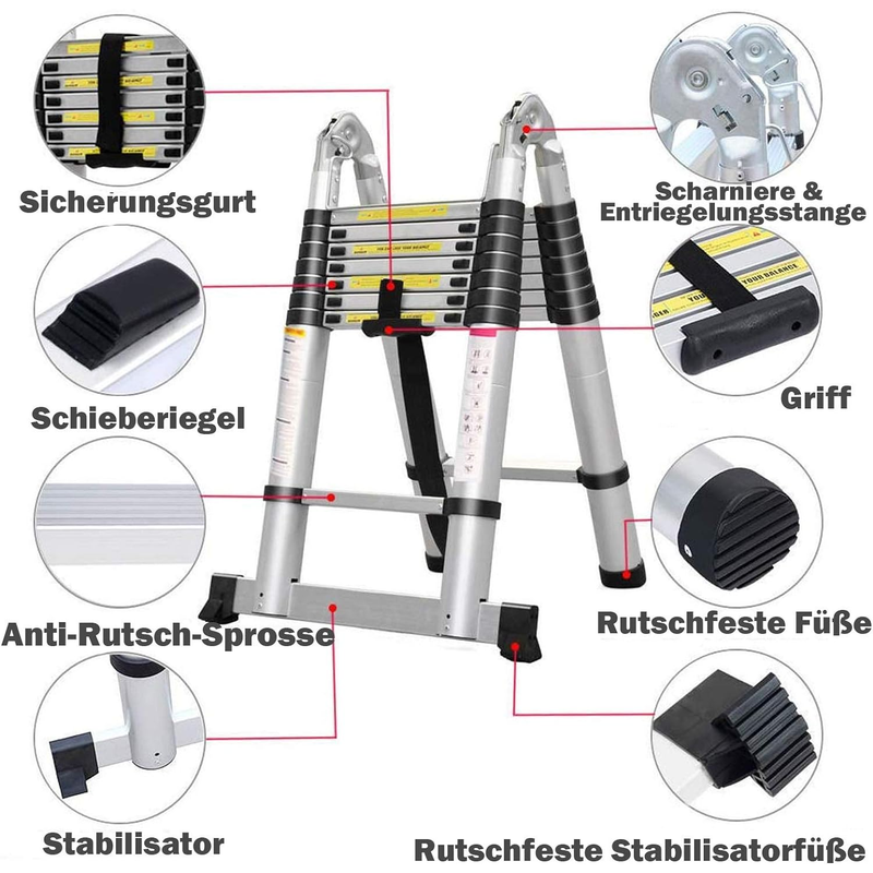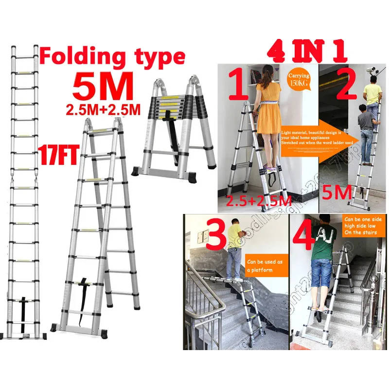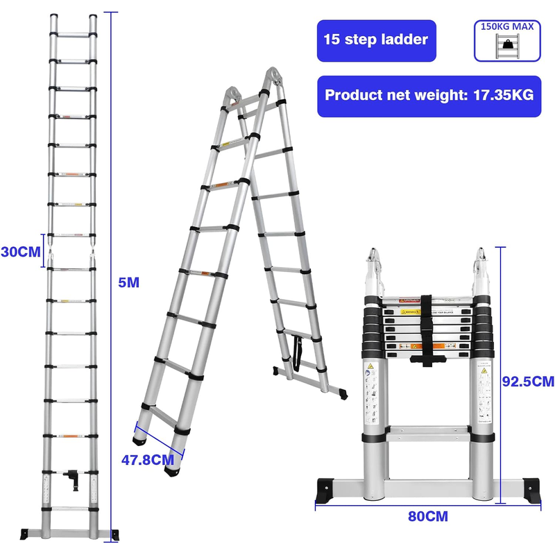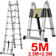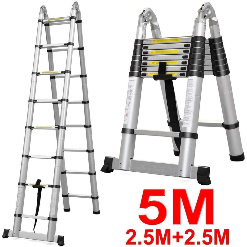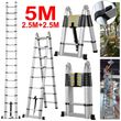 Item: 5 m (2.5 m + 2.5 m) telescopic ladder, aluminium ladder, multi-purpose ladder, foldable, extendable stepladder, non-slip extension ladder, 150 kg load capacity.
