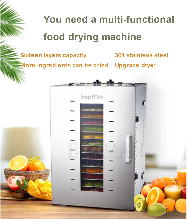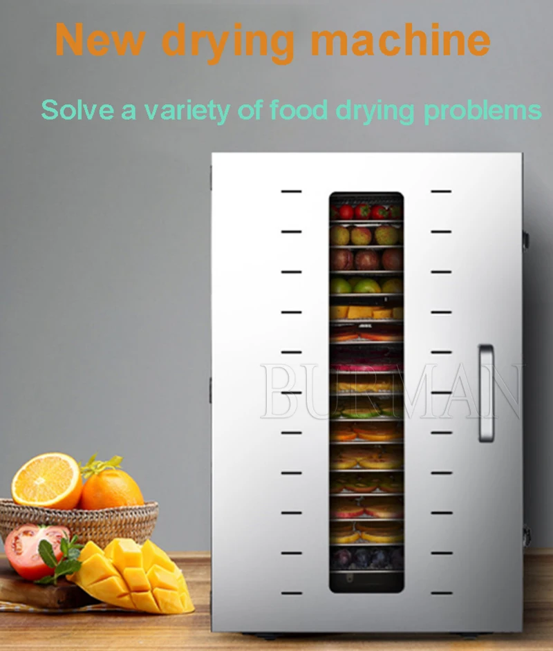 Energy saving, low power consumption and can dry vegetables, fruits,, beans, meat, fish, bread, mushrooms and so on. With hot wind to dry them, no pigment or adhesive or flavor is added. At the same time, the nutrition remains and the keeping time is longer. It is convenient to make natural food with rich flavor for individual or family. It is more easy to keep and more flavor(dried fruit is different with fresh fruit for it is dried and it contains mineral objects and the nutrition is better locked inside). The temperature won’t exceed 100℃, it won’t break the food nutrition.