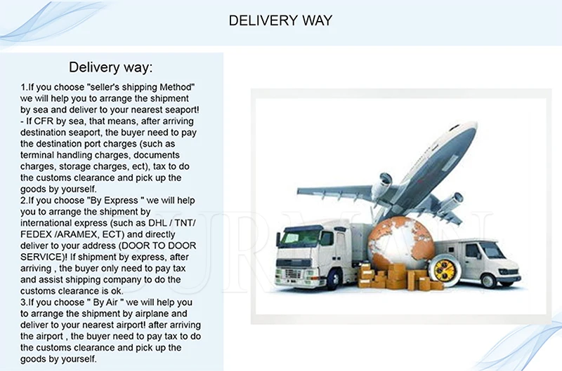 2.If you choose "By Express " we will help you to arrange the shipment by international express (such as DHL / TNT/ FEDEX /ARAMEX, ECT) and directly deliver to your address (DOOR TO DOOR SERVICE)! If shipment by express, after arriving , the buyer only need to pay tax and assist shipping company to do the customs clearance is ok.