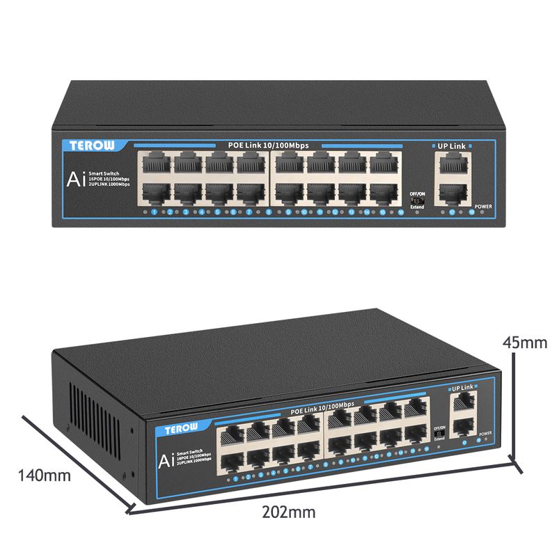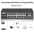16 Ports POE Switch 100Mbps Ethernet Switch POE Network Switch RJ45 hub IEEE802.3af/at IP Camera Video Surveillance Wireless AP