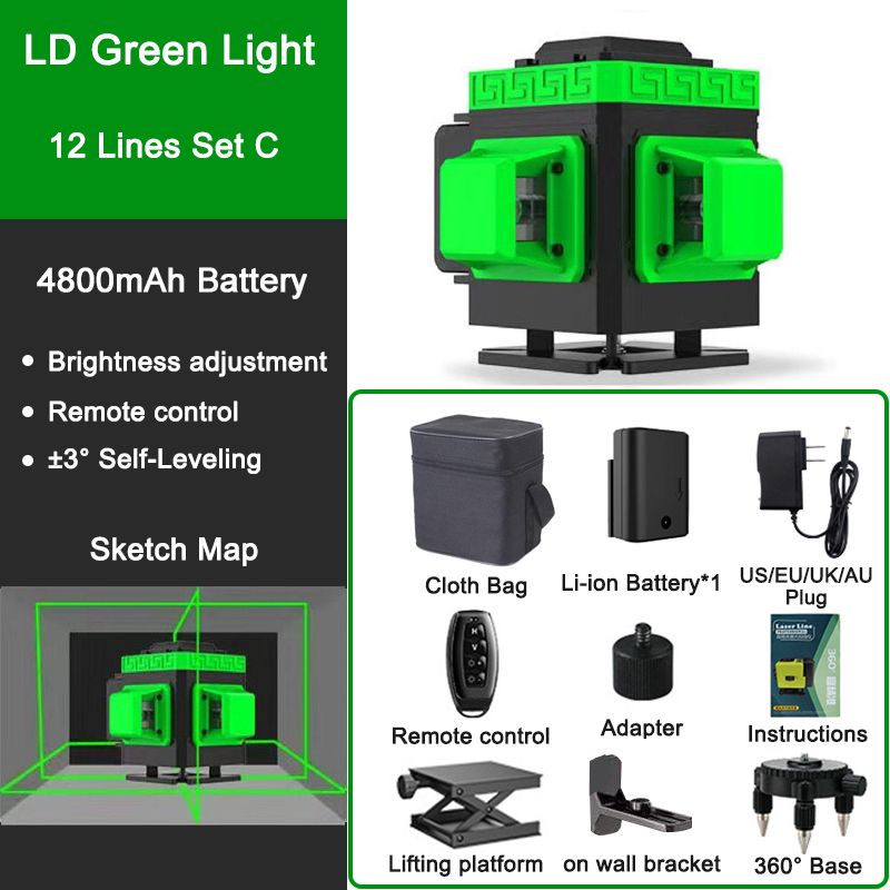 16/12/8 Lines 3D/4D Laser Level 3° Self-Leveling Green Light 360 Horizontal Vertical Cross Lines Beam Powerful Laser Level