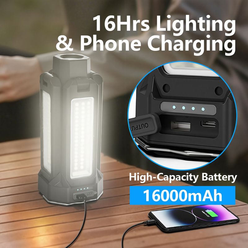 【 16000mAh Rechargeable Battery 】 - This rechargeable camping light is a must-have for camping, with a built-in 16000mAh high-capacity battery that can be used continuously for 22 hours at the lowest brightness. Equipped with USB-A output port and Type-C charging cable, it can be used as a portable power bank to charge mobile phones and other devices. Very suitable for outdoor activities.