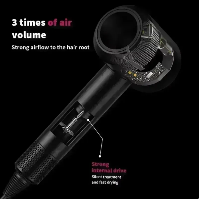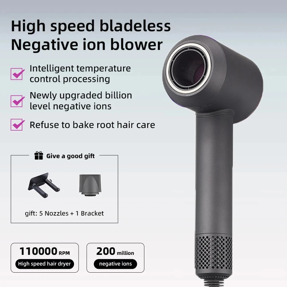 This high-speed bladeless negative ion hair dryer features intelligent temperature control and upgraded billion-level negative ion output, delivering professional root-protecting care without overheating damage.
