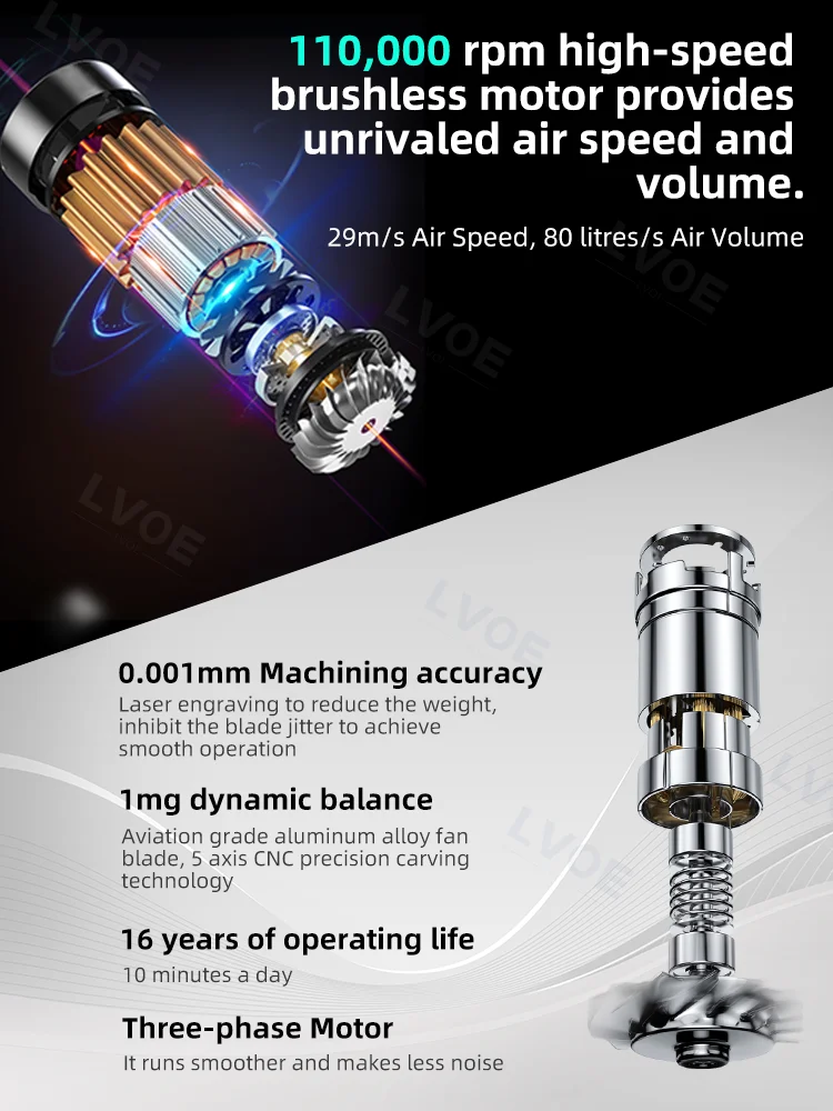 110,000 rpm high-speed brushless motor provides unrivaled air speed andvolume.