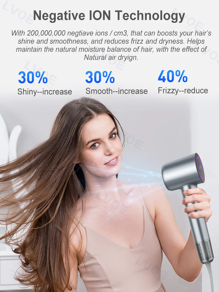 With 200000,000 negative ions / cm3, The NegativeHair Dryer boosts your hair's shine and smoothness;and reduces frizz and dryness.Helps maintain thenatural moisture balance of hair, with the effect ofNatural air dryign.