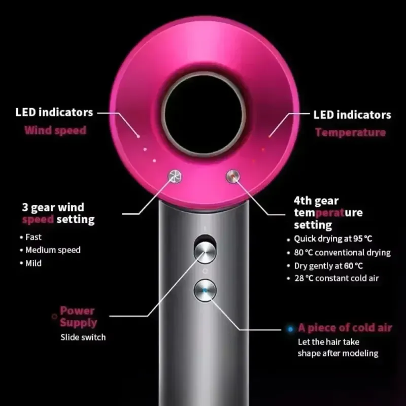 2. 2.Elegant design:With its striking metal color and fuchsia, this dryer is not only functional, but also a fashion accessory that will add a touch of style to your hair care routine.