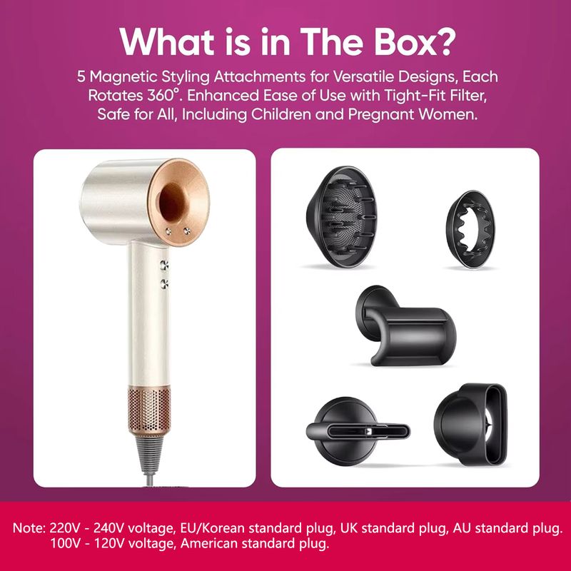 Elegant design:With its striking metal color and fuchsia, this dryer is not only functional, but also a fashion accessory that will add a touch of style to your hair care routine.
