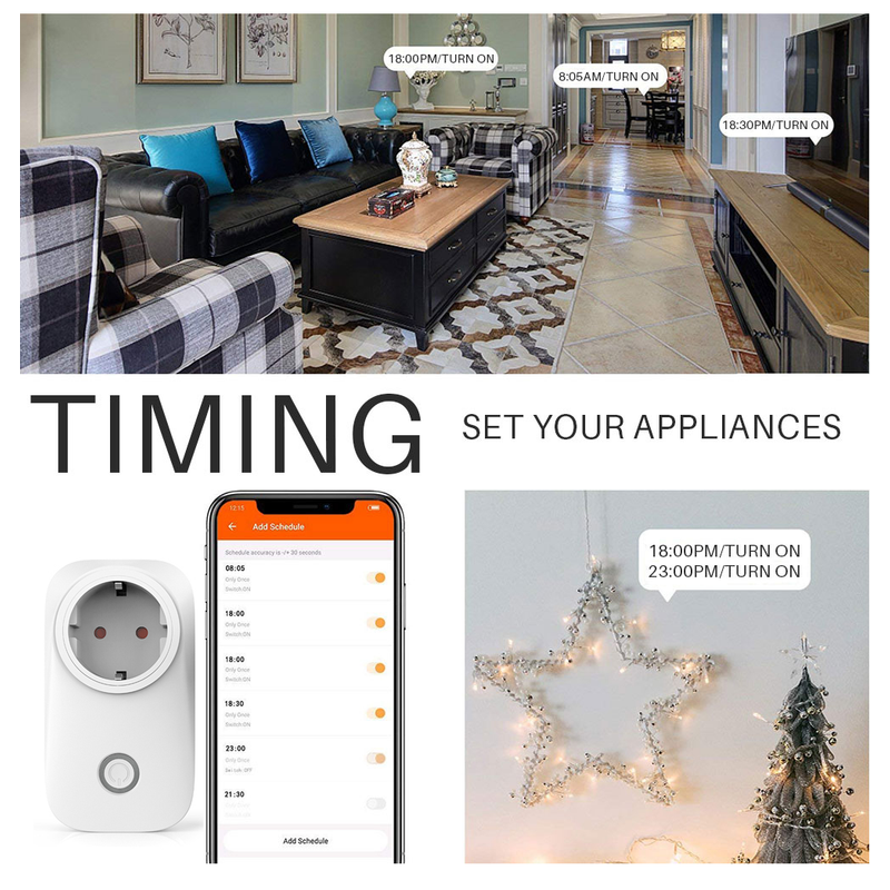 Timing–Set scheduled/countdown/loop timers to turn on/off at specified time