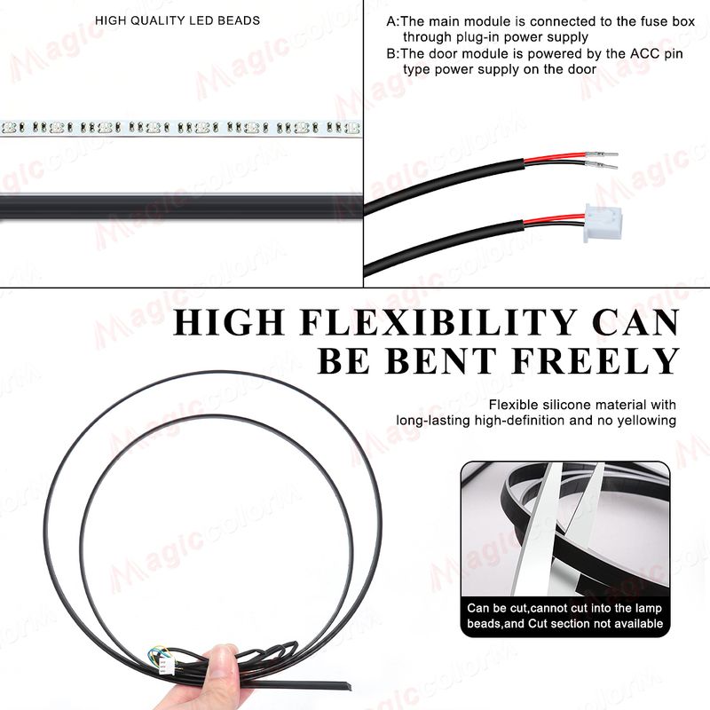 Download the application by the QR code on the main control box first, control light mode via Bluetooth connection. This product include 1 main control box ,4 sub control box. Each controller has a power cable, the main controller is connected to a 5- 12V power supply and the sub controller also needs to be connected to a 5- 12v power supply such as a door power supply. (Negative polar and positive polar)