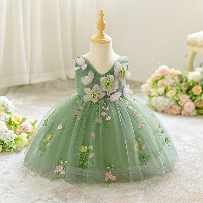 182 Baby Girl Green Pretty Dress Flower Embroidery Sleeveless V Neck Design Elegant Dress