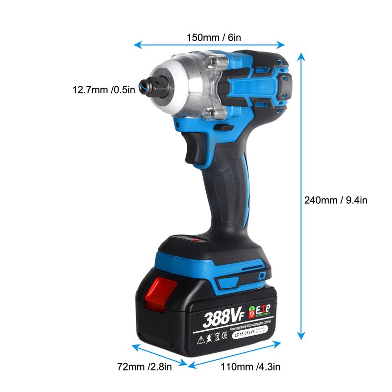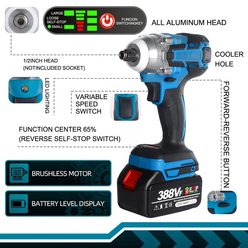 18V 2 In 1 Brushless Cordless Electric Impact Wrench 1/2Inch Power Tools 15000Amh Li Battery LED light Adapt To Makita Battery