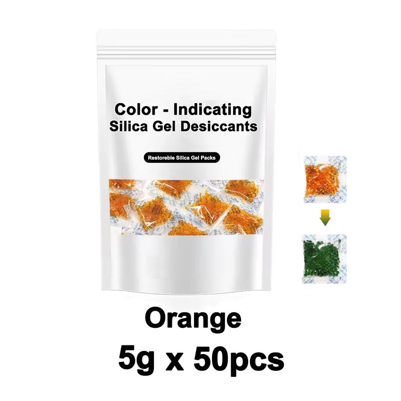 INDICATING DESICCAN & REUSABLE: Silica gel contains orange indicator beads, orange beads absorb moisture gradually saturated will become dark green, users can quickly tell when desiccant needs to be recharged or replace a new. In addition, they can be easily reactivated by heating in the microwave, oven, or exposure to sunlight (note: the temperature should not be too high and the time should not be too long, or the outer packaging may melt.)