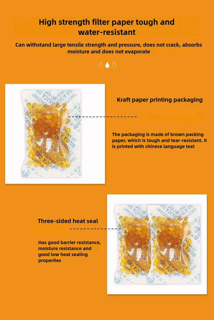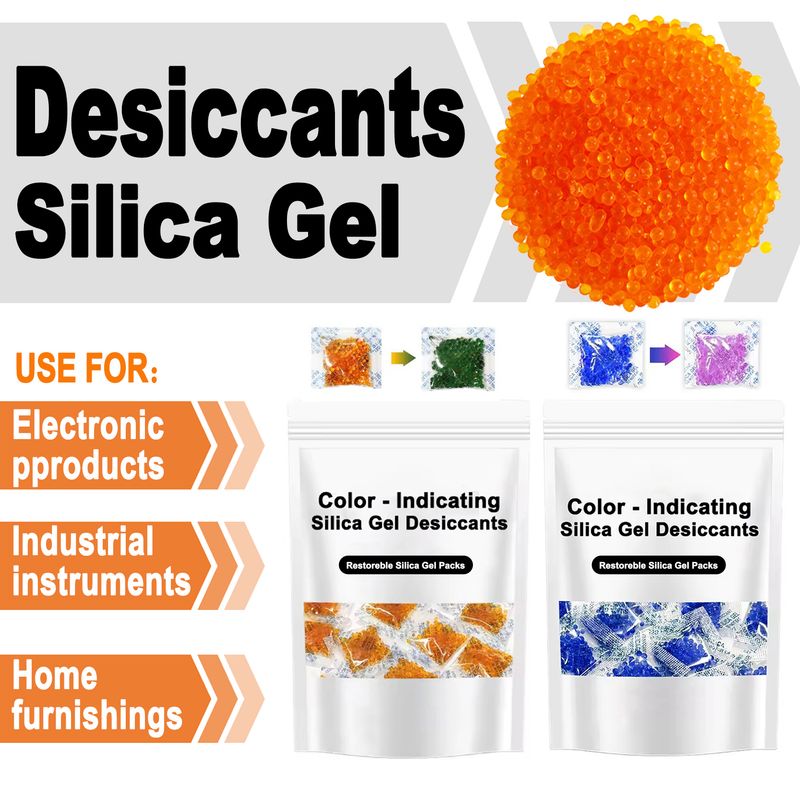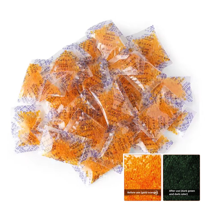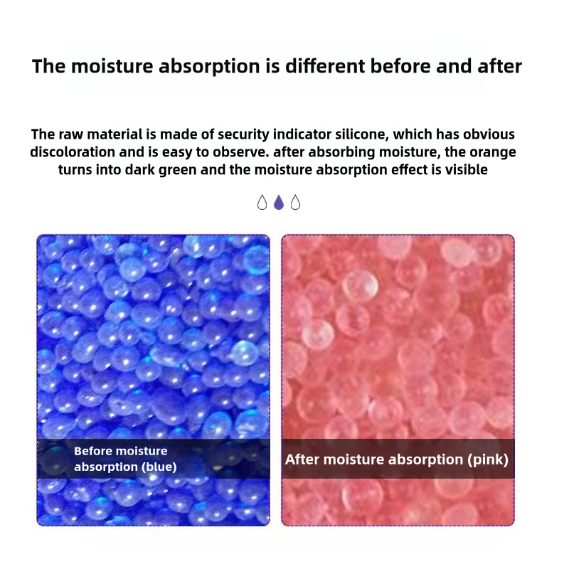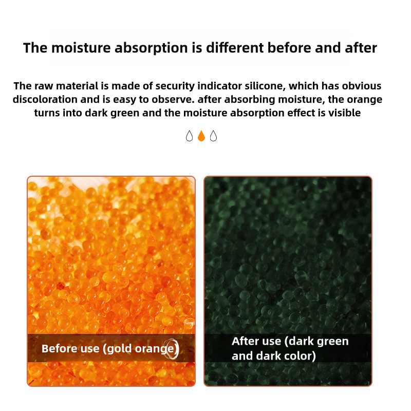 INDICATING DESICCAN & REUSABLE: Silica gel contains orange indicator beads, orange beads absorb moisture gradually saturated will become dark green, users can quickly tell when desiccant needs to be recharged or replace a new. In addition, they can be easily reactivated by heating in the microwave, oven, or exposure to sunlight (note: the temperature should not be too high and the time should not be too long, or the outer packaging may melt.)