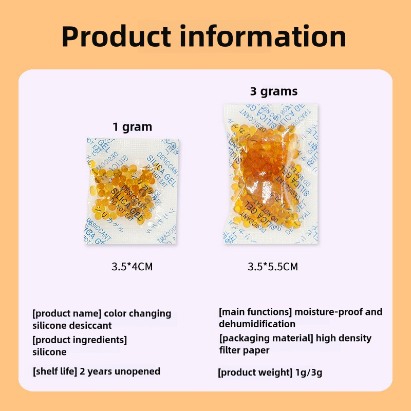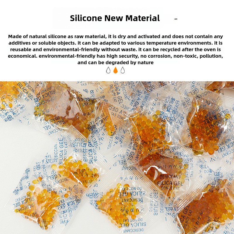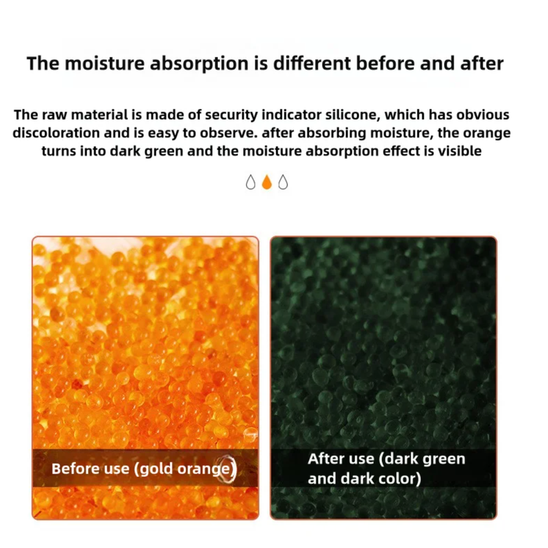 INDICATING DESICCAN & REUSABLE: Silica gel contains orange indicator beads, orange beads absorb moisture gradually saturated will become dark green, users can quickly tell when desiccant needs to be recharged or replace a new. In addition, they can be easily reactivated by heating in the microwave, oven, or exposure to sunlight (note: the temperature should not be too high and the time should not be too long, or the outer packaging may melt.)