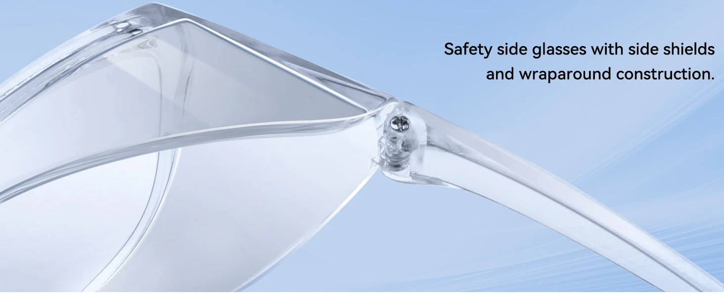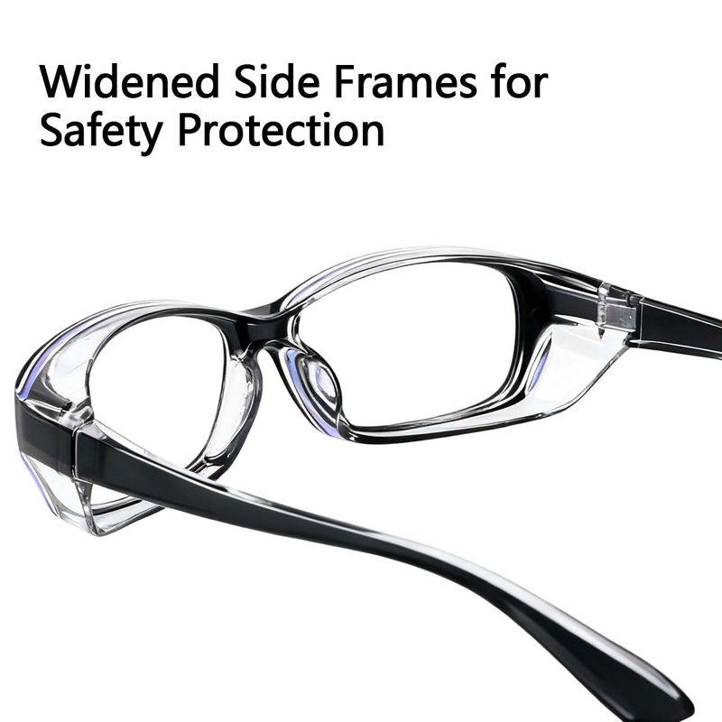Safety from All Sides: The safety glasses with widened side and top shield cover design, make it better fit the contours of your face and fully protect your eyes from accidental chemical splashes, flying debris, dust, sprays, liquids or saliva droplets, Unlike common clear goggles, our glasses come with a top-notch coating. This makes them super tough on the outside, resisting impacts, scratches, acids, and alkalis.