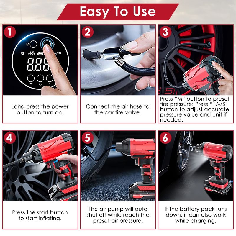 *Digital Display & LED Lighting*:Equipped with a high-brightness and high-precision display screen,you can easily check the tire pressure and pre-set the pressure value. The LED lighting makes operation more convenient in darkness. Besides,ergonomic handle design is more comfortable to hold in hand when operating.