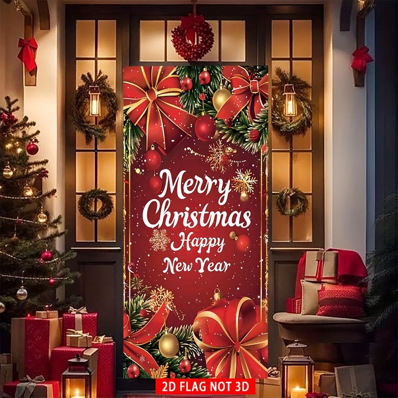 1pc, Christmas Happy door cover flag, polyester material, red background Christmas decorative pattern, New Year Happy porch
