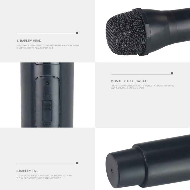 It adopts a highly textured mesh head and a plastic shell body, which is very similar to the real microphone. The mesh head and the tube body are integrated naturally.