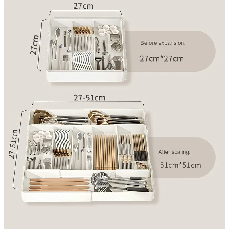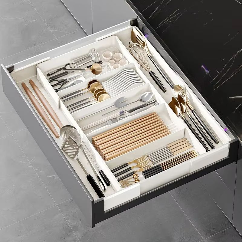 1. The retractable drawer and partitioned storage box can hold tableware, knives, forks, spoons, chopsticks, ornaments and stationery