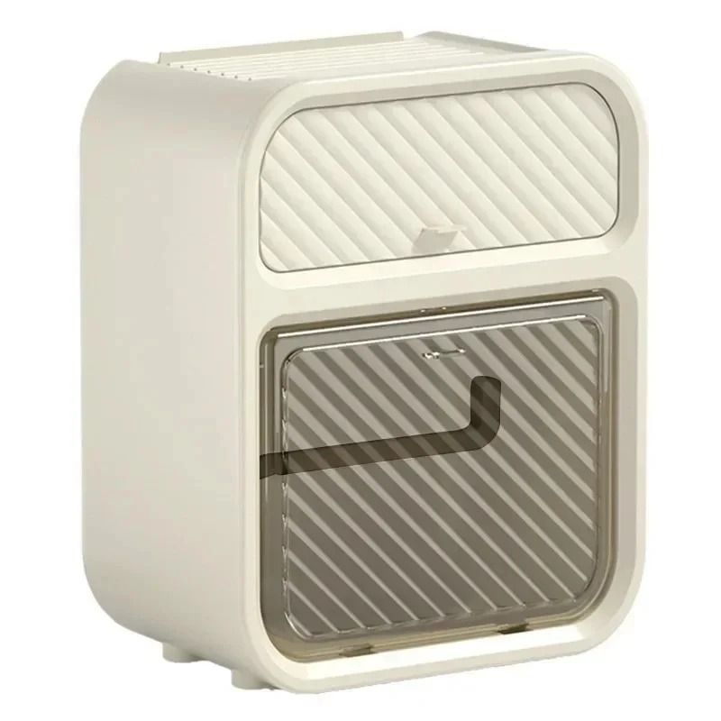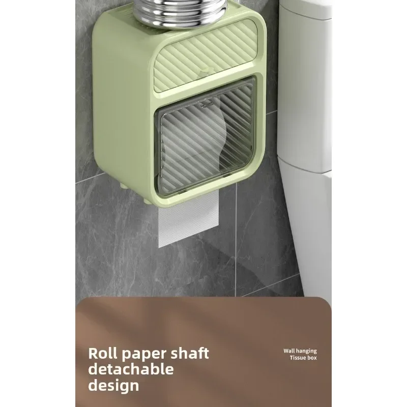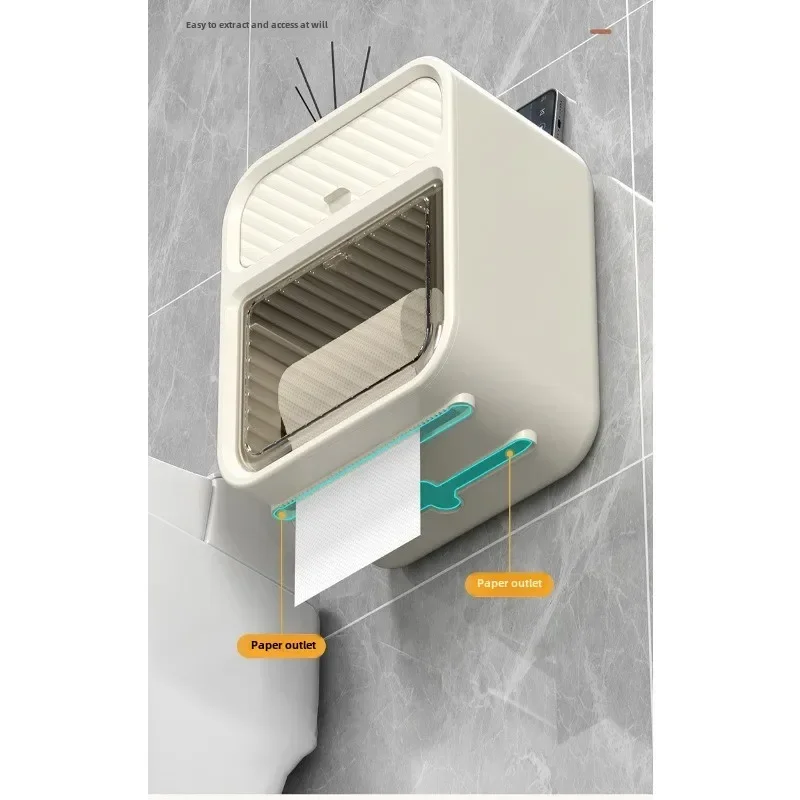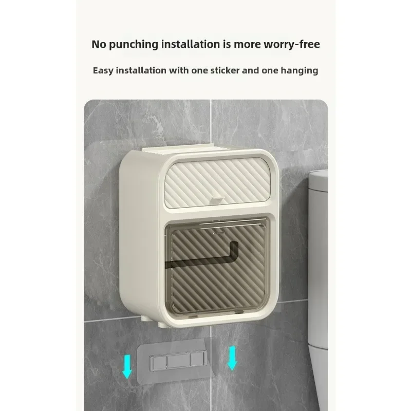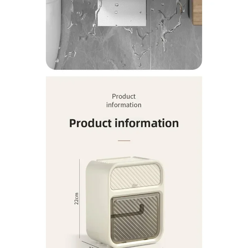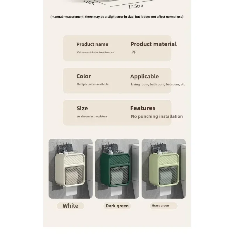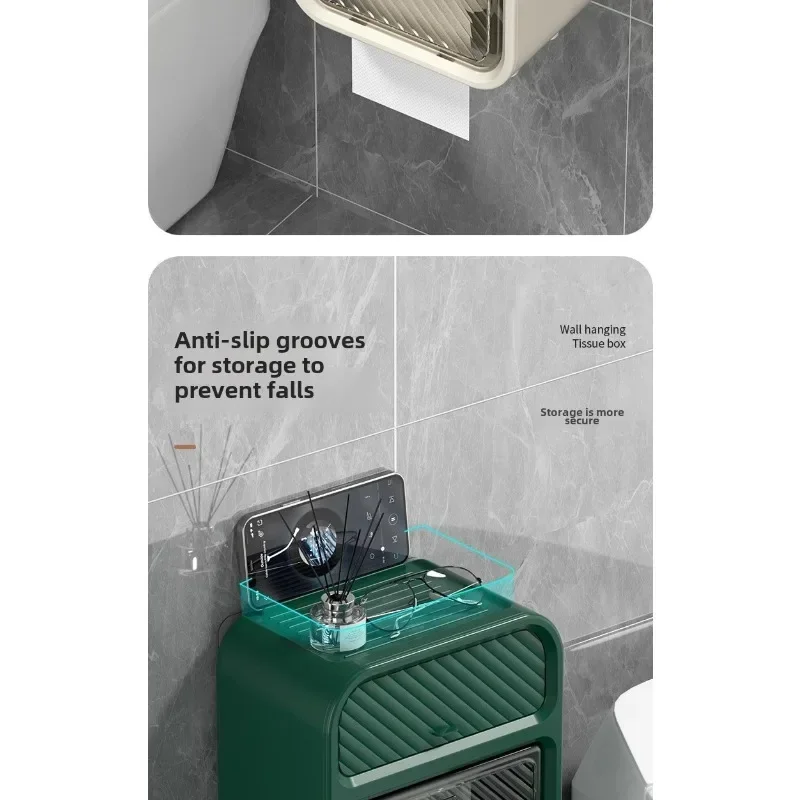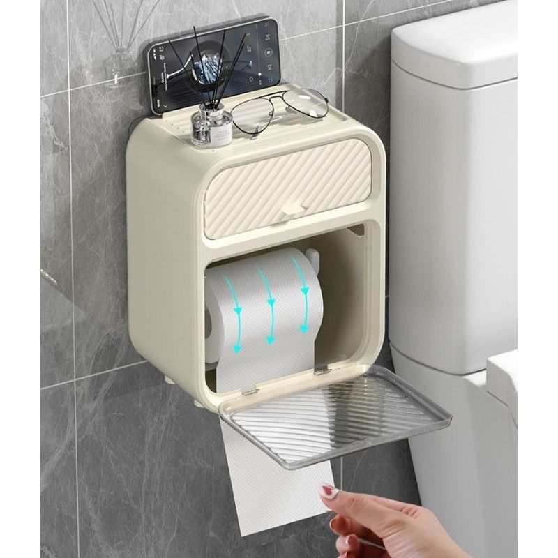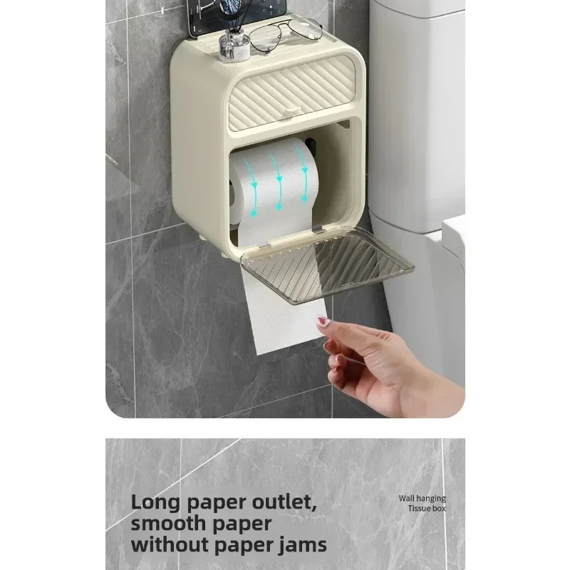 This simple and stylish wall mounted multifunctional tissue box in the bathroom does not require drilling and pasting installation, does not damage tiles/walls, and saves valuable space. The double-layer partition design understands life: the lower layer is a double outlet storage area for roll paper and paper drawer, which can easily accommodate a roll of toilet paper and can also be placed synchronously with the drawer paper; The upper hidden drawer is perfect for hiding personal belongings; At the top, you can easily place your phone, aromatherapy, and glasses, making it super convenient to squat in the toilet, watch TV shows, and relax! ABS+PS waterproof material is suitable for humid environments in bathrooms. Whether installed in the bathroom, living room, or bedroom, it is a stylish and practical storage tool。