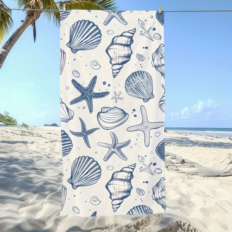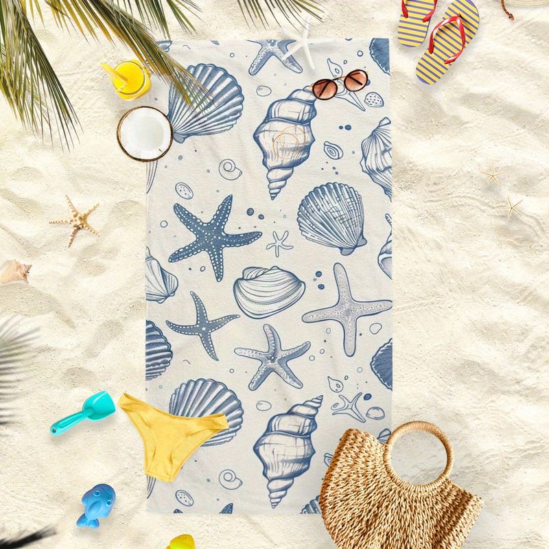 1pc Oceanic Shell and Starfish Print Beach Towel | Ideal for Sunbathing and Beach Fun, Polyester Microfiber,Summer Holiday Theme