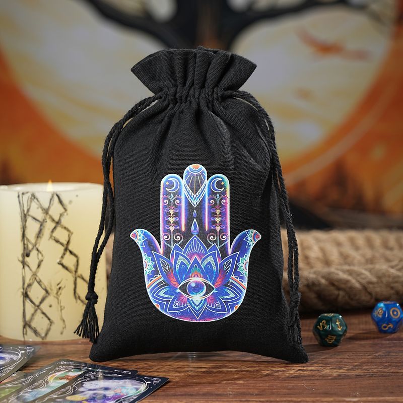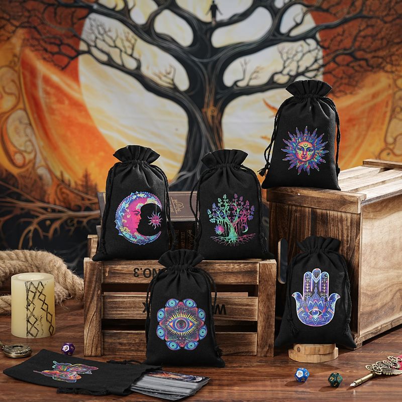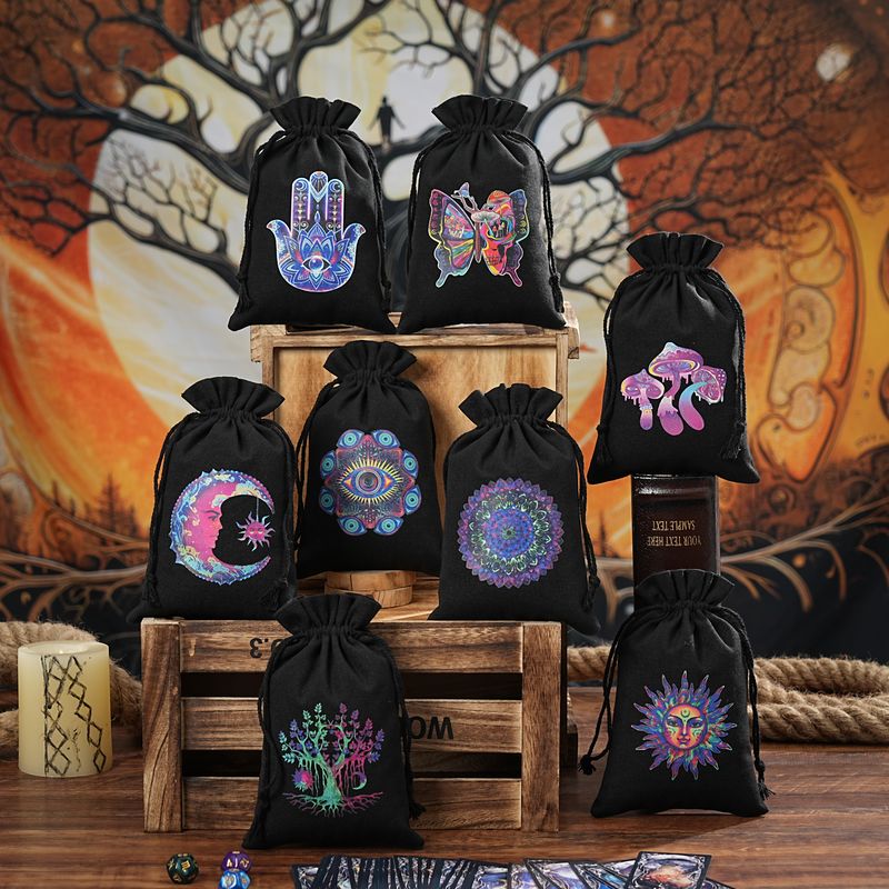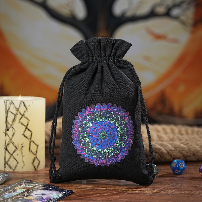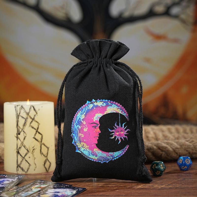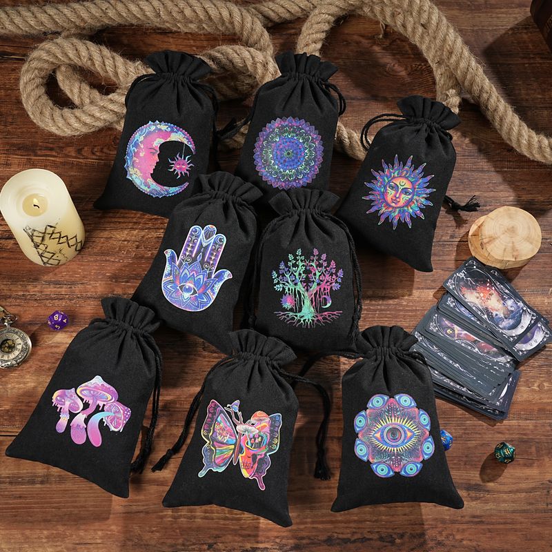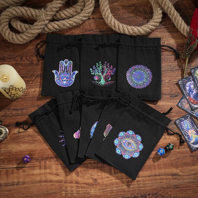 This bag is handmade of polyester cotton material and features high-quality color printing technology. The product size is 14x22cm/5.51x8.66inch, with a large capacity, suitable for storing most sizes of Tarot cards. It is also suitable for storing cosmetics, jewelry, dice, gifts, etc.