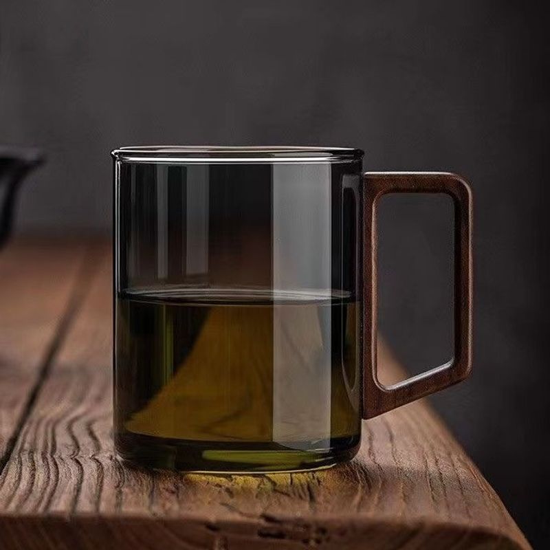 1pcs 400ml/500ml Walnut Wood Handle Glass Cup for Home and Office Use, Drinking Cup, High Temperature Resistant, Guest Water Cup