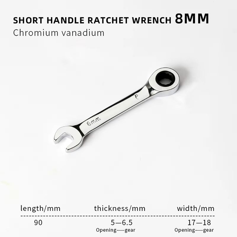 - Versatile and Durable: The 6-19mm Short Handle Quick Ratchet Wrench is a versatile tool designed for a wide range of applications. Crafted from high-quality chromium-vanadium steel, this wrench is built to withstand the rigors of heavy-duty use. Its double-ended design allows for quick and efficient tightening or loosening of bolts and nuts, making it an indispensable addition to any toolbox. The short handle and dual-use plum blossom design ensure that it can fit into tight spaces, making it perfect for automotive, industrial, and home repair tasks.