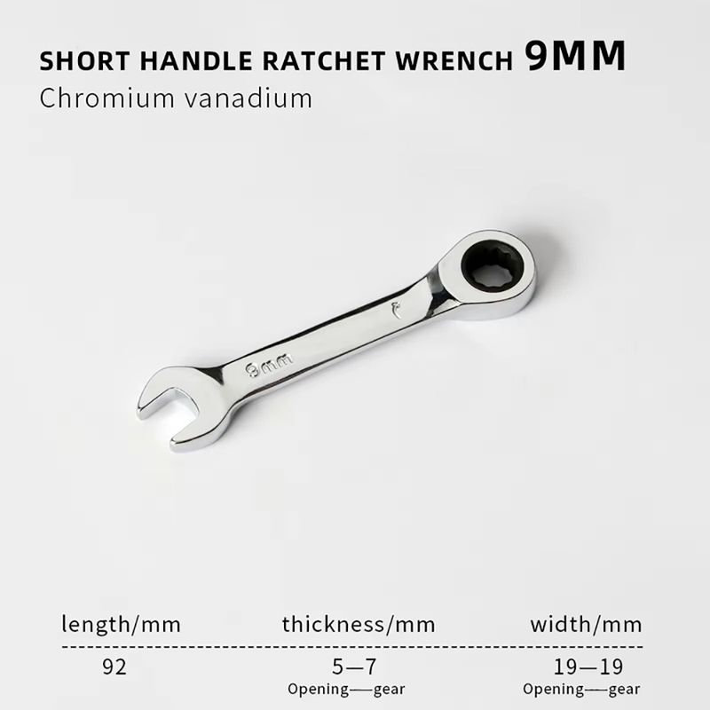- Versatile and Durable: The 6-19mm Short Handle Quick Ratchet Wrench is a versatile tool designed for a wide range of applications. Crafted from high-quality chromium-vanadium steel, this wrench is built to withstand the rigors of heavy-duty use. Its double-ended design allows for quick and efficient tightening or loosening of bolts and nuts, making it an indispensable addition to any toolbox. The short handle and dual-use plum blossom design ensure that it can fit into tight spaces, making it perfect for automotive, industrial, and home repair tasks.