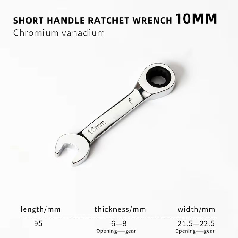 - Versatile and Durable: The 6-19mm Short Handle Quick Ratchet Wrench is a versatile tool designed for a wide range of applications. Crafted from high-quality chromium-vanadium steel, this wrench is built to withstand the rigors of heavy-duty use. Its double-ended design allows for quick and efficient tightening or loosening of bolts and nuts, making it an indispensable addition to any toolbox. The short handle and dual-use plum blossom design ensure that it can fit into tight spaces, making it perfect for automotive, industrial, and home repair tasks.