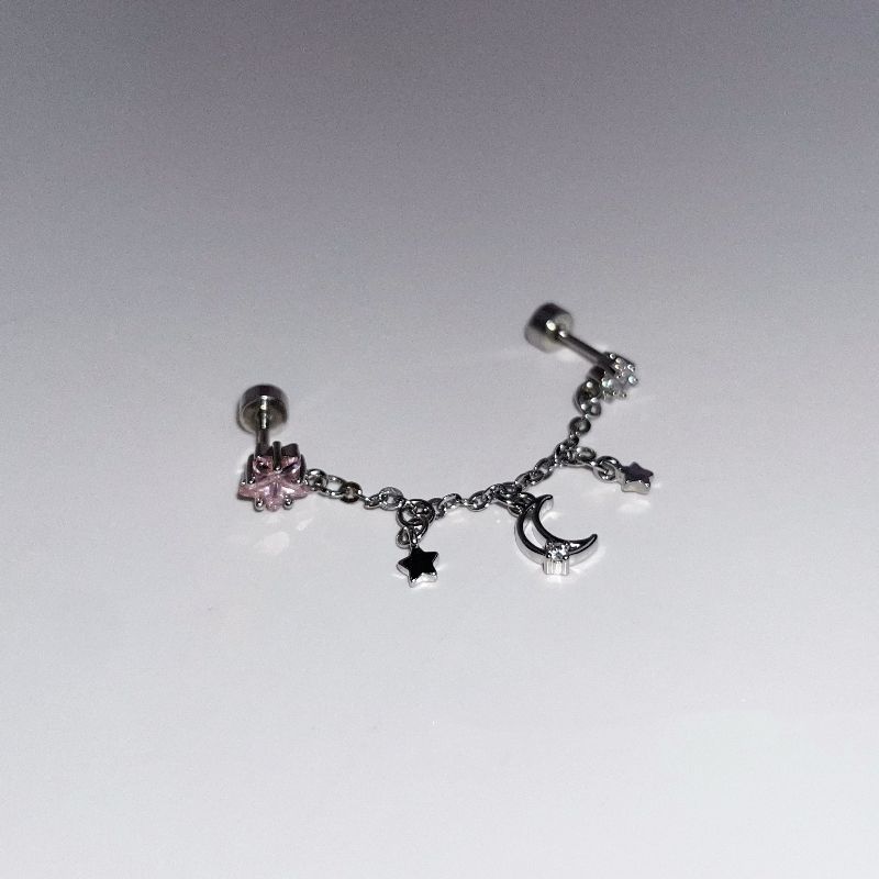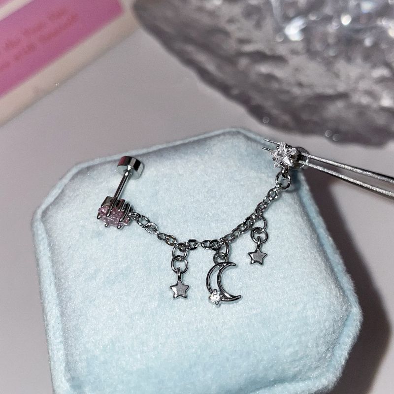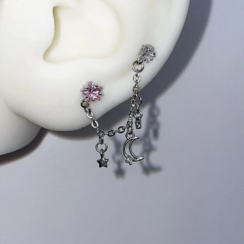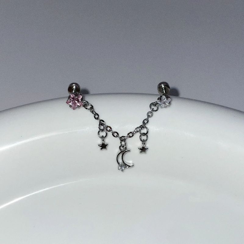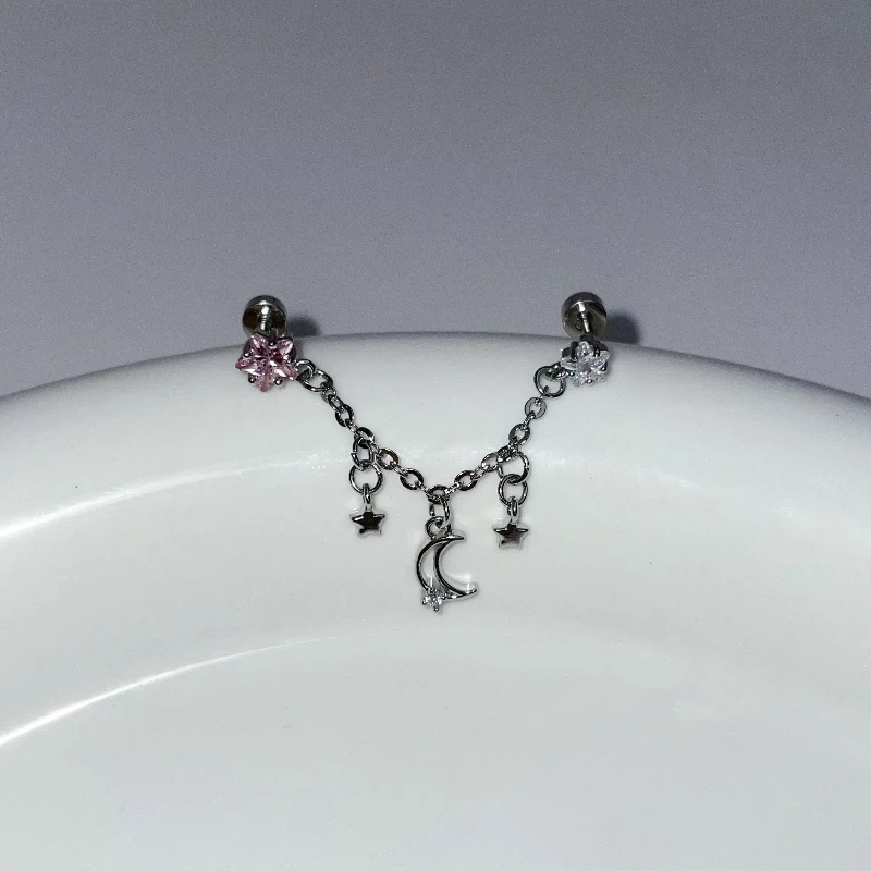1PCS Star and Moon Double Chain Ear Hole 316L Stainless Steel Ear Bone Nail Y2K Fashion Titanium Steel Ear Jewelry for Women