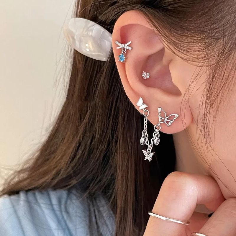 1PCS Star and Moon Double Chain Ear Hole 316L Stainless Steel Ear Bone Nail Y2K Fashion Titanium Steel Ear Jewelry for Women