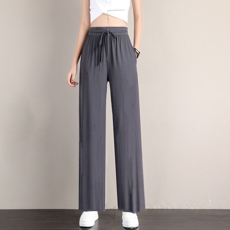 1pcs Summer Women Ice Silk Pant Female High Elastic Waist Drawstring Pocket Loose Straight Trousers Student Sports Straight Pant
