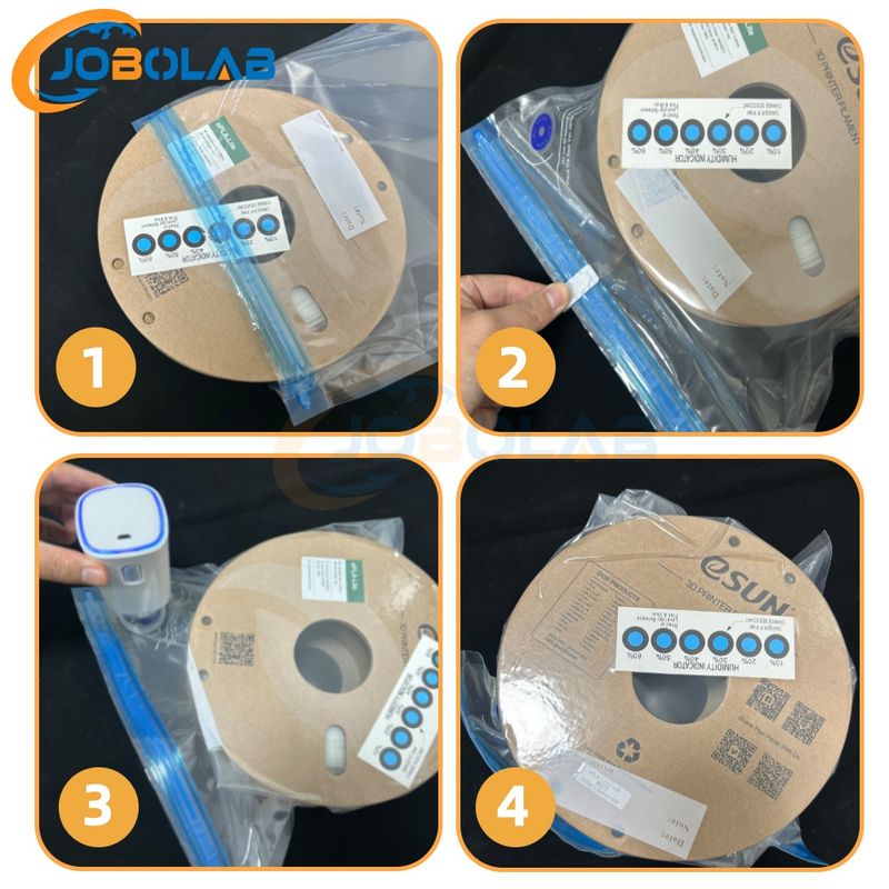 [HOW TO USE] Put the spool into the bag, seal it with a sealing clip, and then use a hand pump to remove excess air. Wet 3D printing filaments can cause wire draw