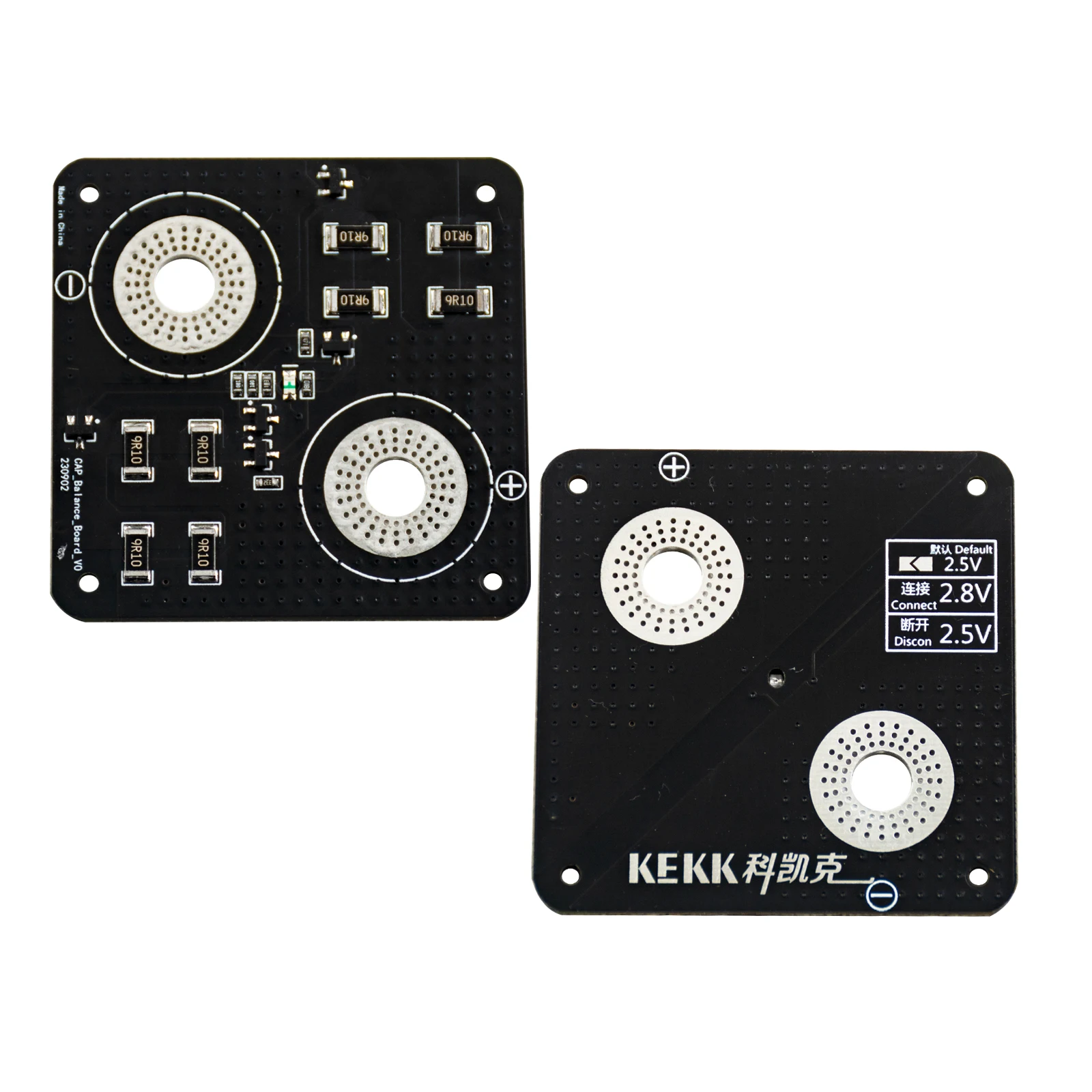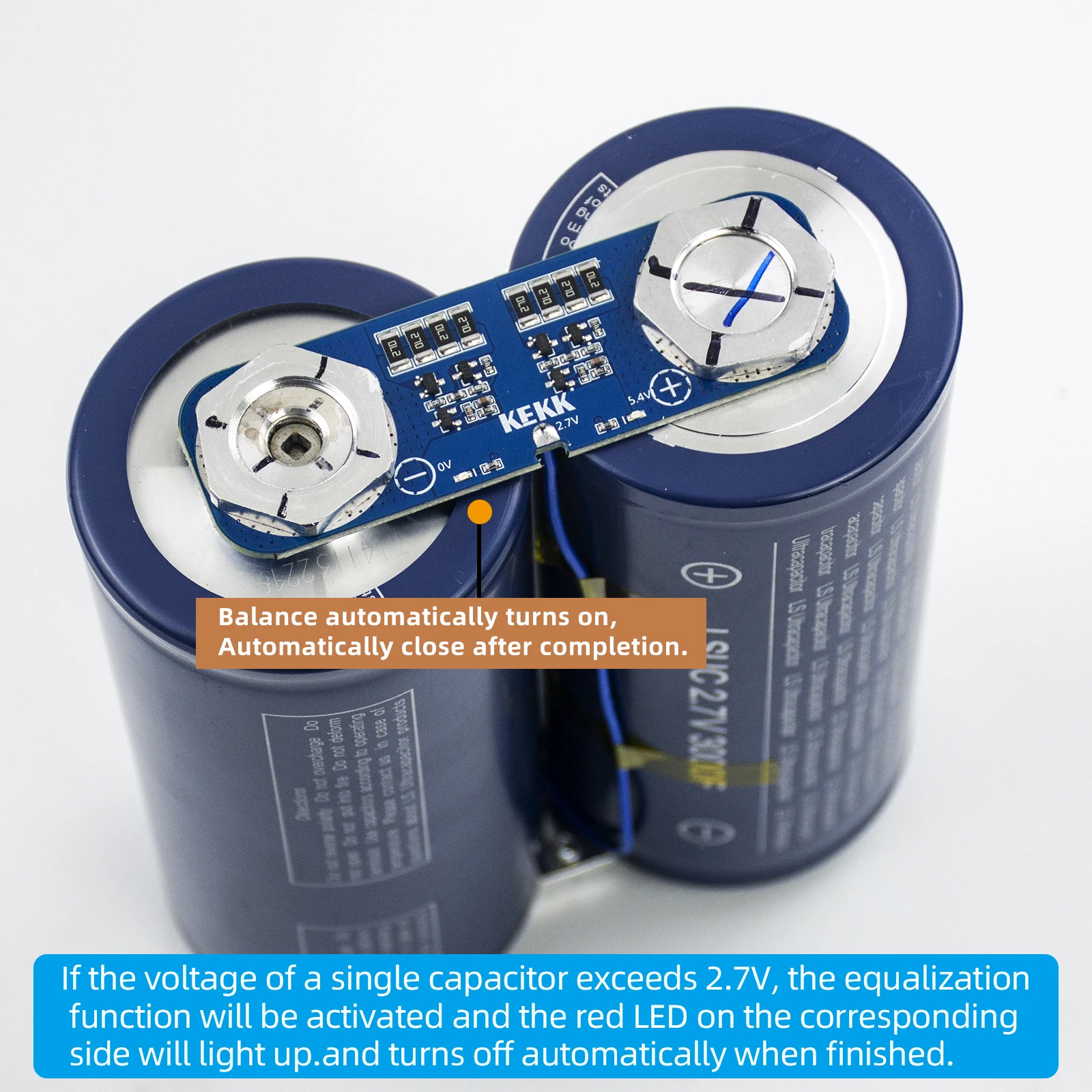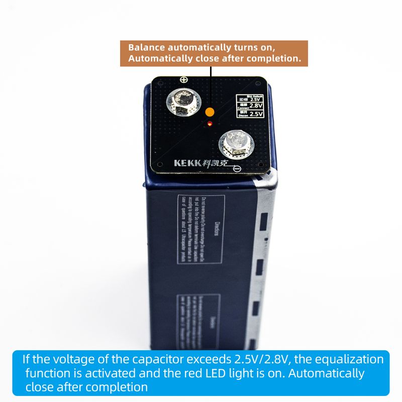 If the voltage of a single capacitor exceeds 2.7V, the equalization function will be activated and the red LED on the corresponding side will light up.and turns off automatically when finished.