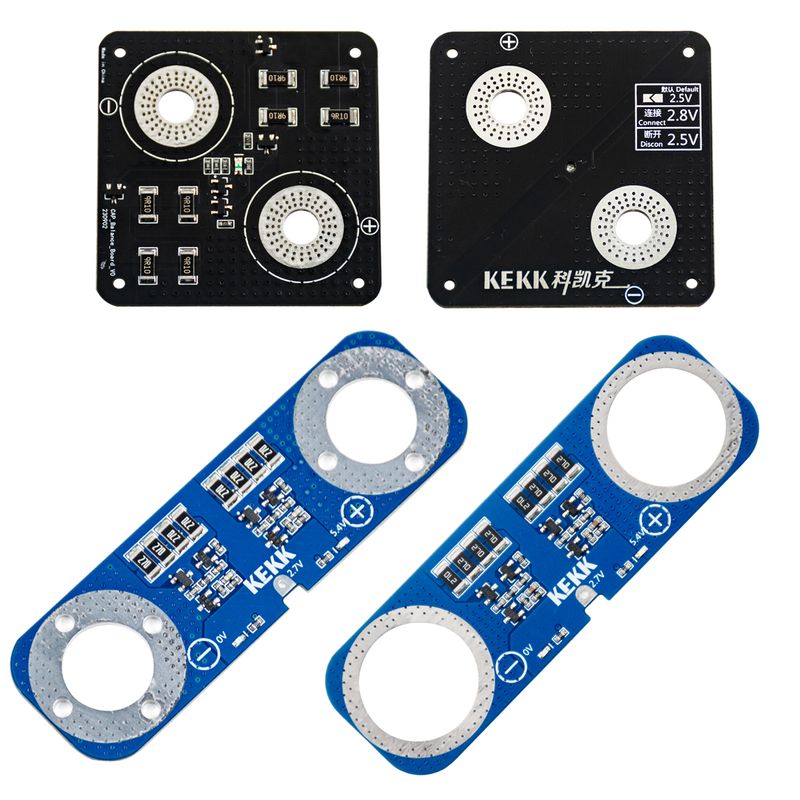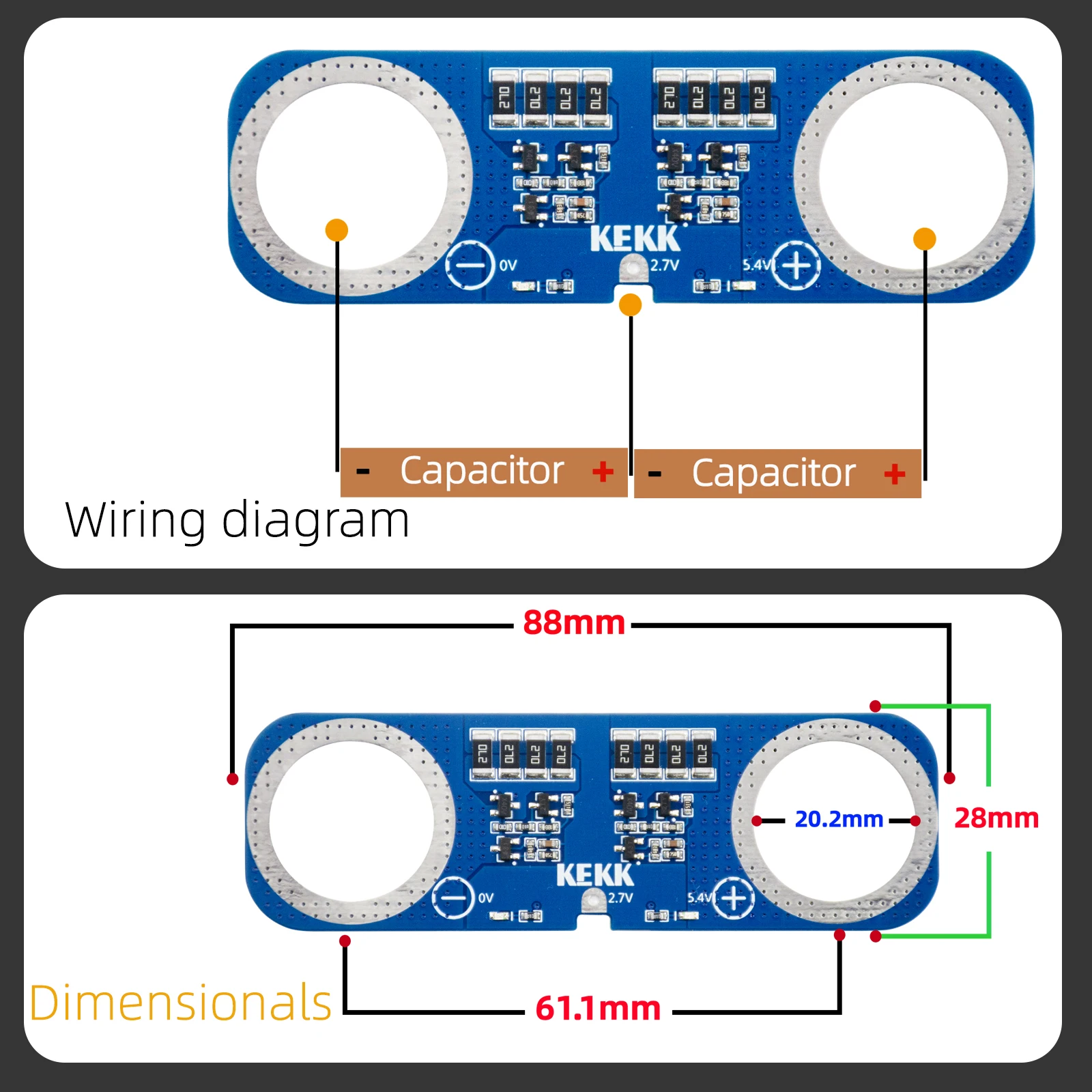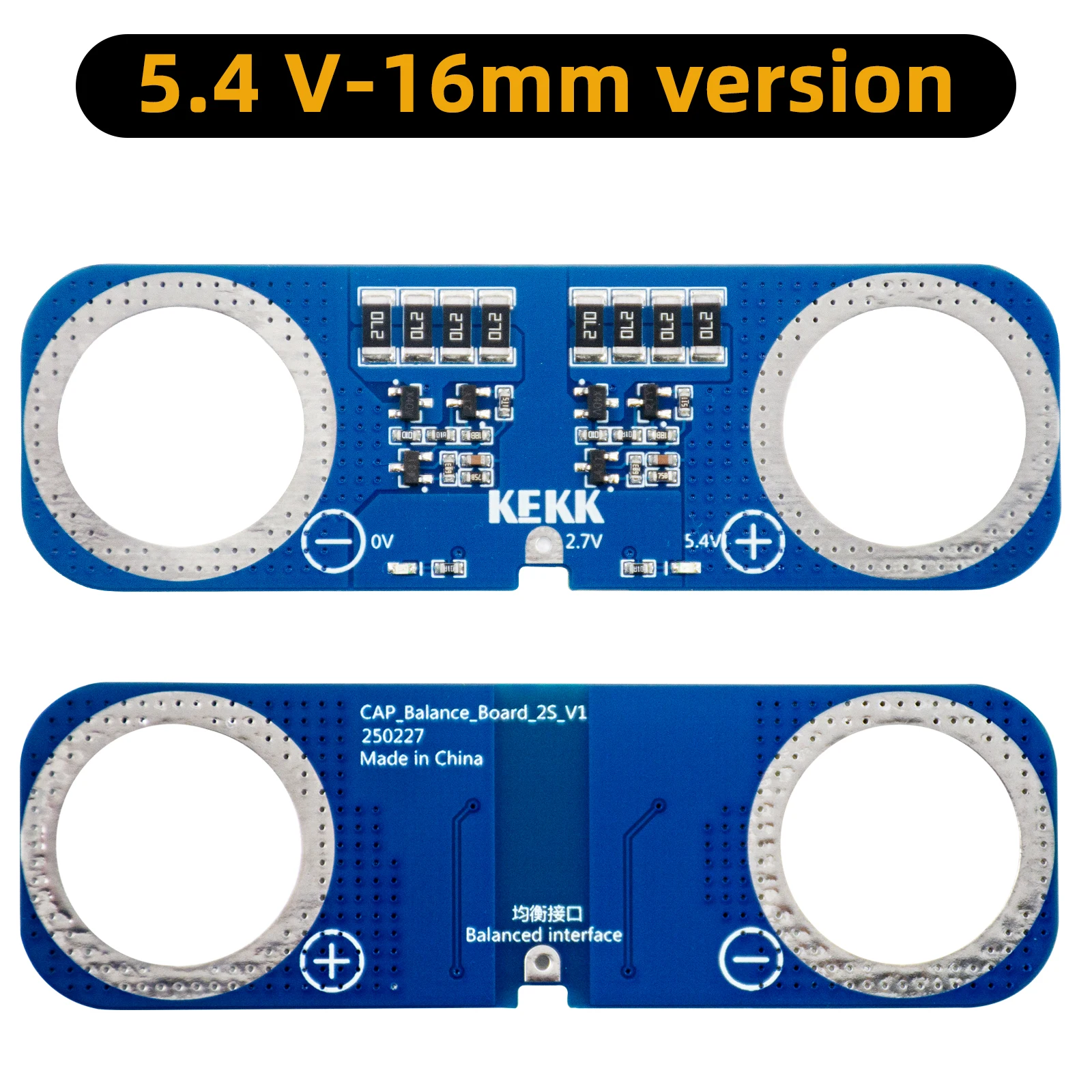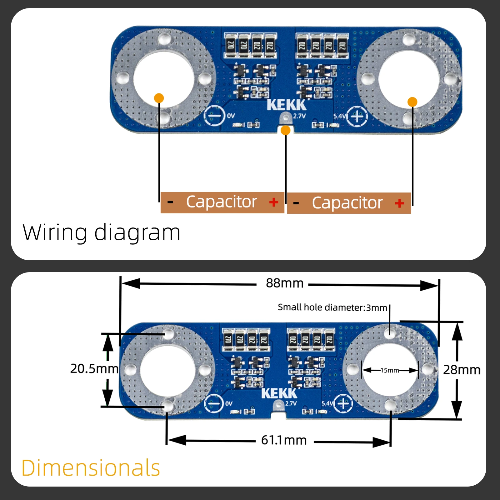 If the voltage of a single capacitor exceeds 2.7V, the equalization function will be activated and the red LED on the corresponding side will light up.and turns off automatically when finished.