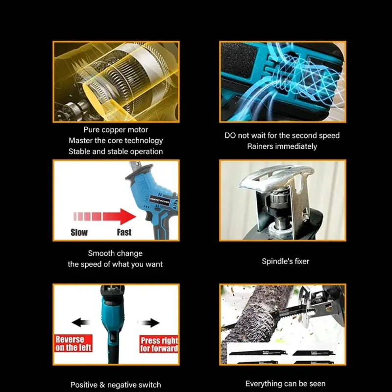 A handheld reciprocating saw has 4 gears on the bottom plate so can adjust it to control the cutting position of the saw blade, improving performance and increasing efficiency.