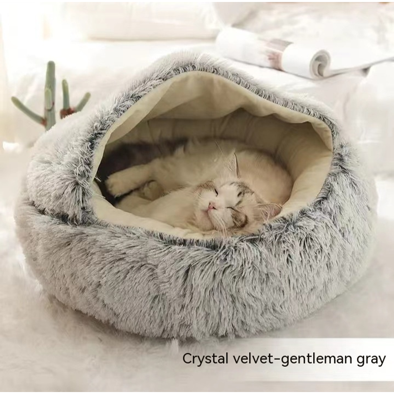 2 In 1 Dog And Cat Bed Pet Winter Bed Round Plush Warm Bed House Soft Long Plush Pets Bed Pet Products Grey short plush