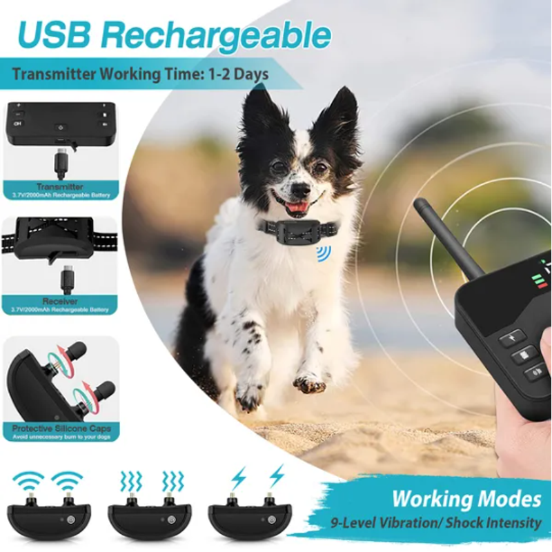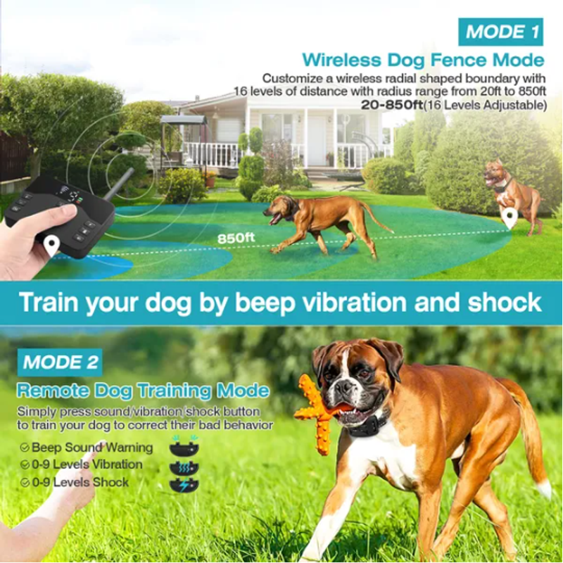 *Wireless Dog Fence Mode*:This dog fence system customize a wireless radial shaped boundary with 16 levels of distance with radius range from 20ft to 850ft. When your dog is out of range,the receiver collar will trigger sound,vibration and shock to your dogs,and these modes will stop until your dog go back to the circle. 1 Transmitter can connect with several receiver collars and all receivers will connect with the transmitter automatically once they power on.
