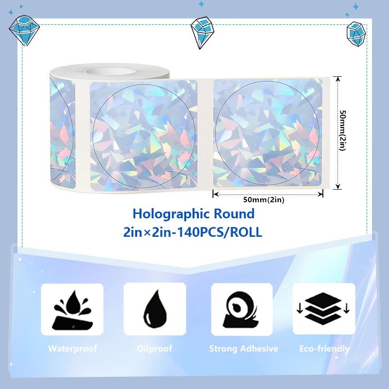 2 Inch Diamond Holographic Thermal Label fit for Phomemo m110/m220 Silver Round Self-Adhesive Direct Thermal Labels140label/roll