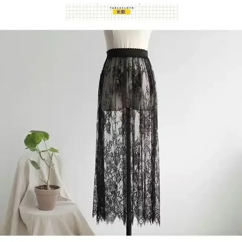 2 Length Elegant Black Skirt White Lace Transparent Long Tulle Skirt Ladies Elastic High Waist Beach Midi Skirt Drop shipping