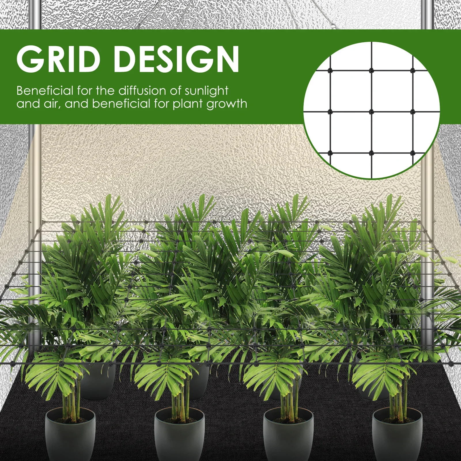 Promotes Vegetation Growth with Grid Design : Adopts a grid structure that facilitates the diffusion of sunlight , water and air . It allows vegetation to be evenly exposed to light , creating optimal conditions for healthy growth